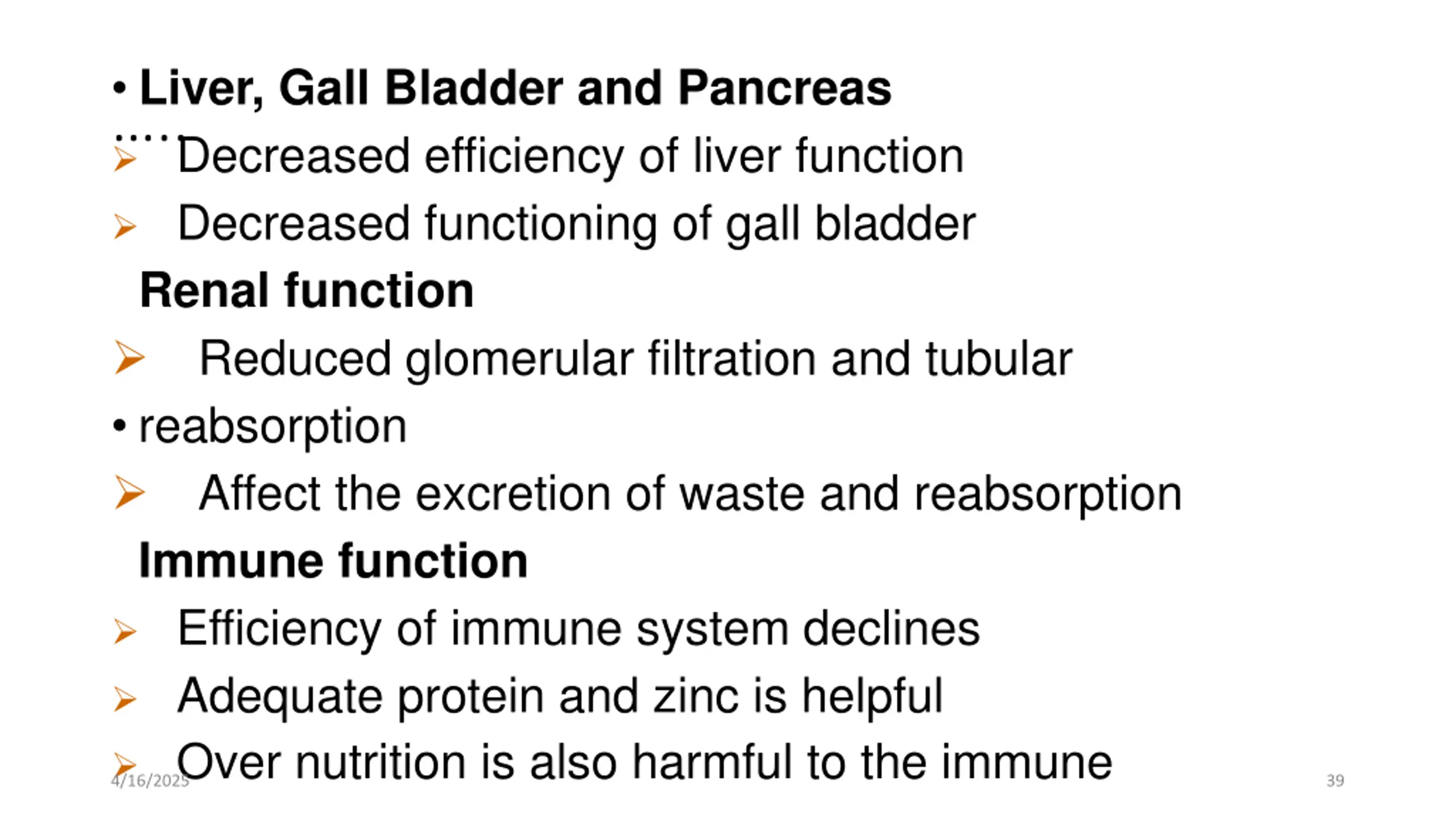 Liver, Gall Bladder and Pancreas .. Decreased efficiency of liver function Decreased functioning of gall bladder Renal function Reduced glomerular filtration and tubular reabsorption Affect the excretion of waste and reabsorption Immune function Efficiency of immune system declines Adequate protein and zinc is helpful Over nutrition is also harmful to the immune 4/16/2025 39