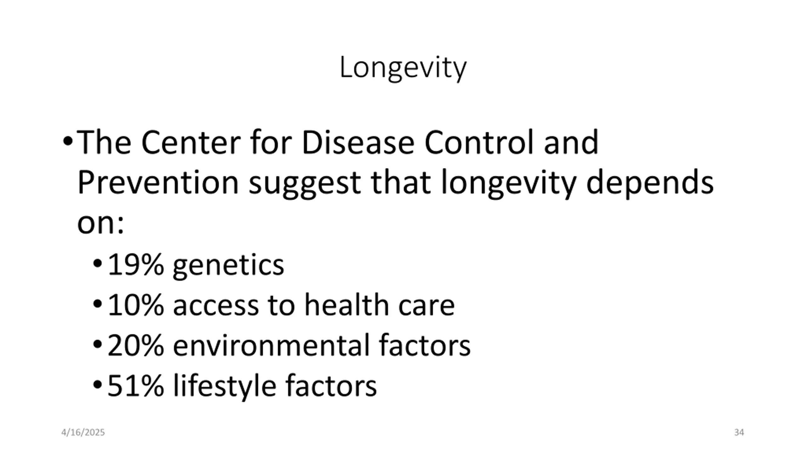 Longevity The Center for Disease Control and Prevention suggest that longevity depends on: 19% genetics 10% access to health care 20% environmental factors 51% lifestyle factors 4/16/2025 34