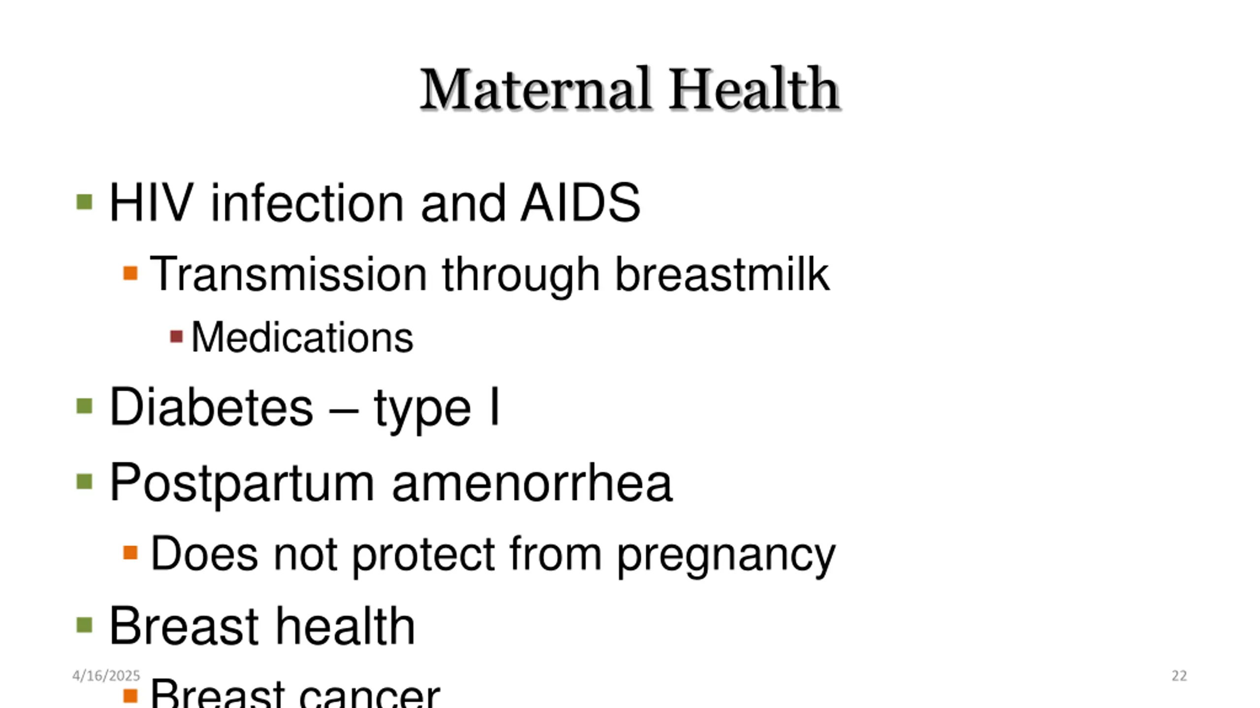 Maternal Health HIV infection and AIDS Transmission through breastmilk Medications Diabetes type I Postpartum amenorrhea Does not protect from pregnancy Breast health Breast cancer 4/16/2025 22