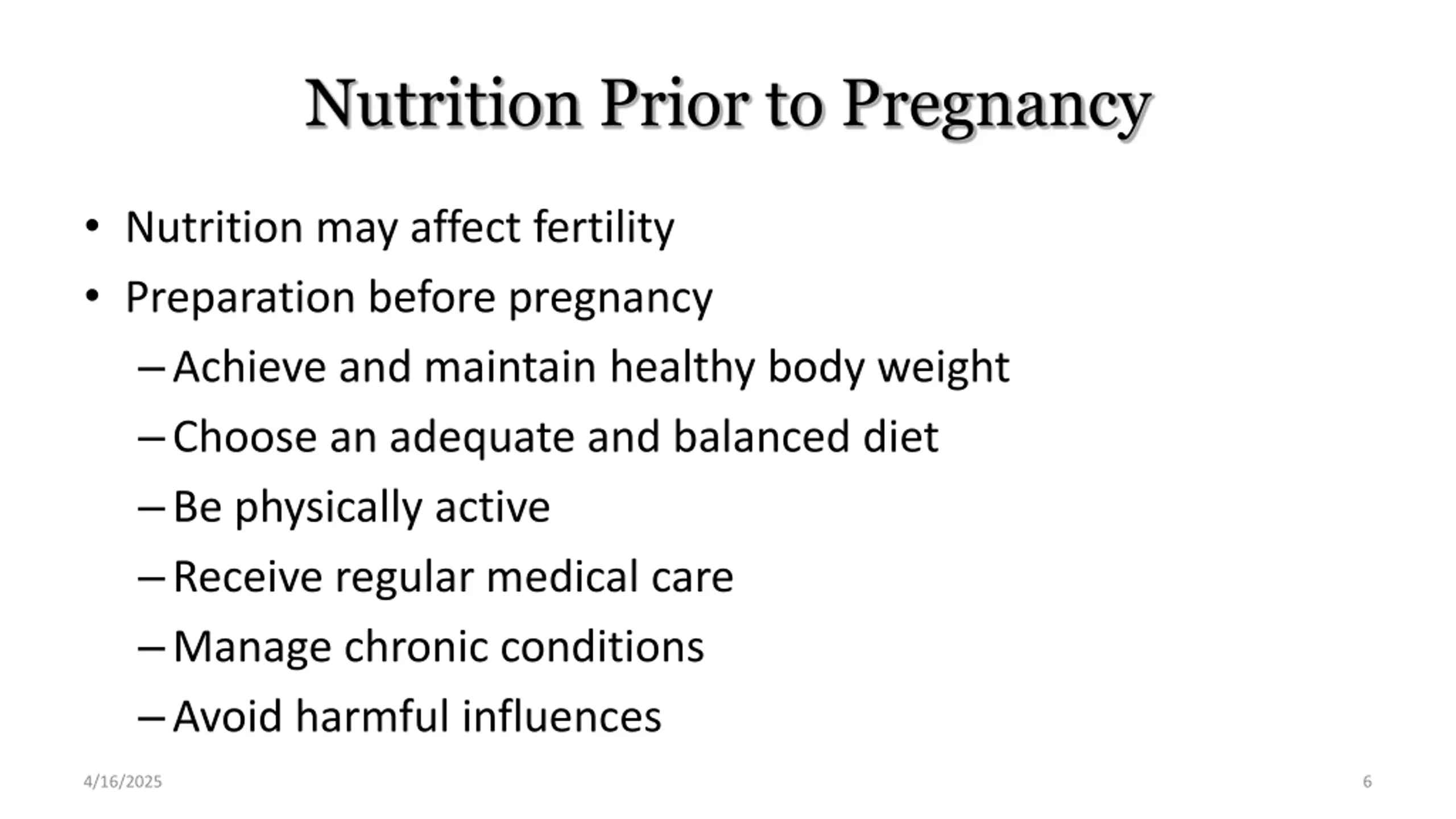 Nutrition Prior to Pregnancy Nutrition may affect fertility Preparation before pregnancy Achieve and maintain healthy body weight Choose an adequate and balanced diet Be physically active Receive regular medical care Manage chronic conditions Avoid harmful influences 4/16/2025 6