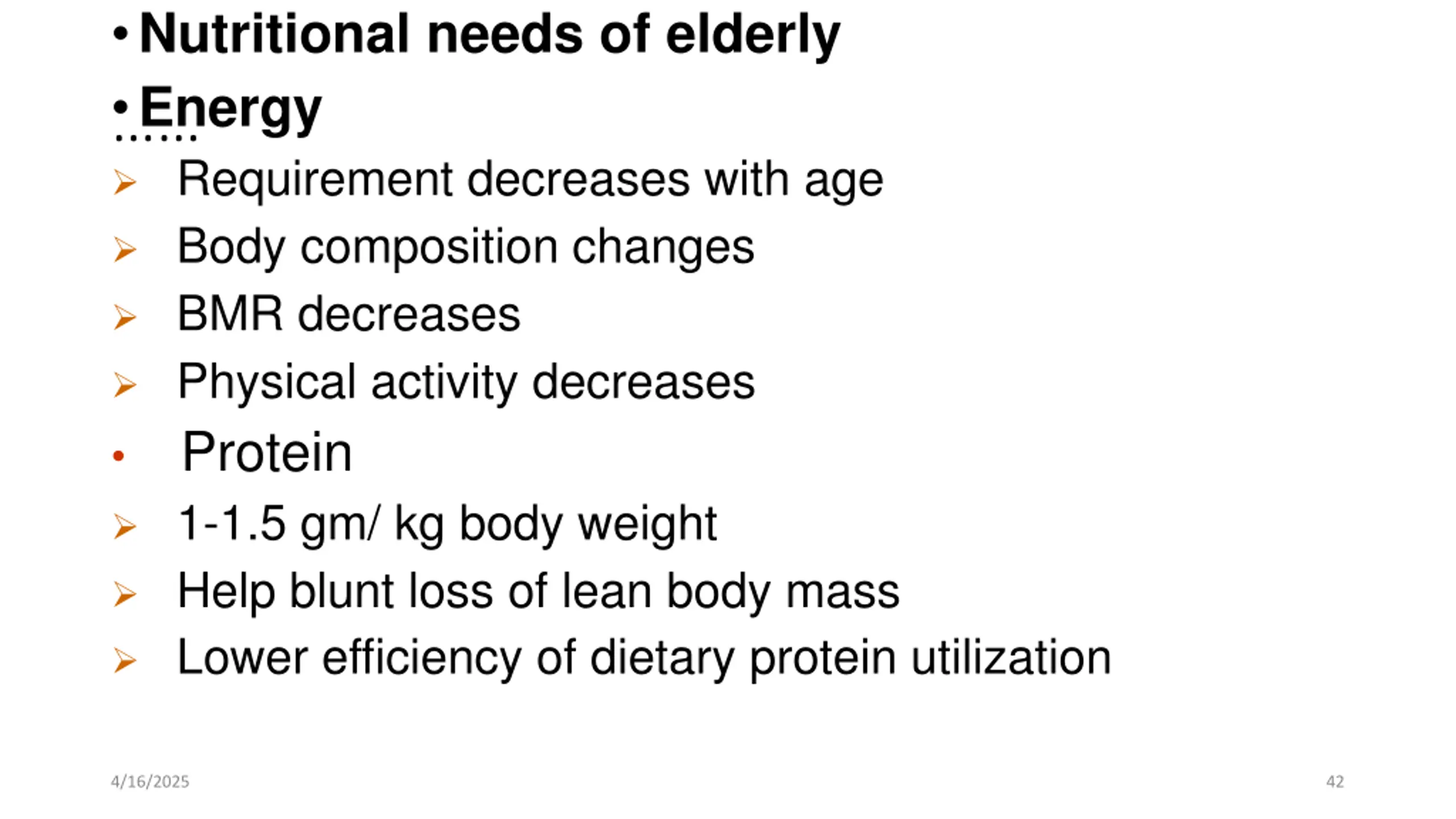 Nutritional needs of elderly Energy Requirement decreases with age Body composition changes BMR decreases Physical activity decreases Protein 1-1.5 gm/ kg body weight Help blunt loss of lean body mass Lower efficiency of dietary protein utilization 4/16/2025 42