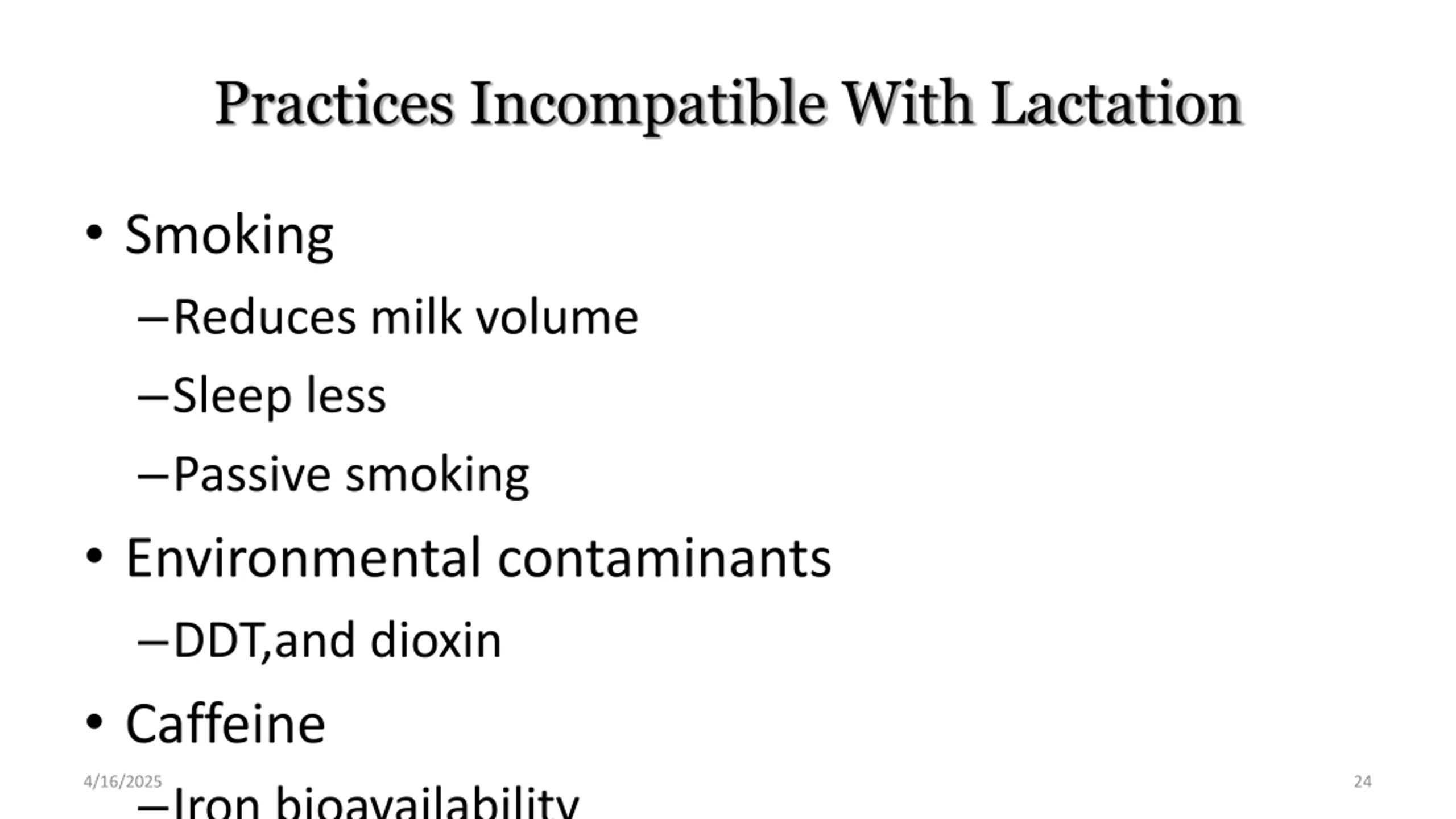 Practices Incompatible With Lactation Smoking Reduces milk volume Sleep less Passive smoking Environmental contaminants DDT,and dioxin Caffeine Iron bioavailability 4/16/2025 24