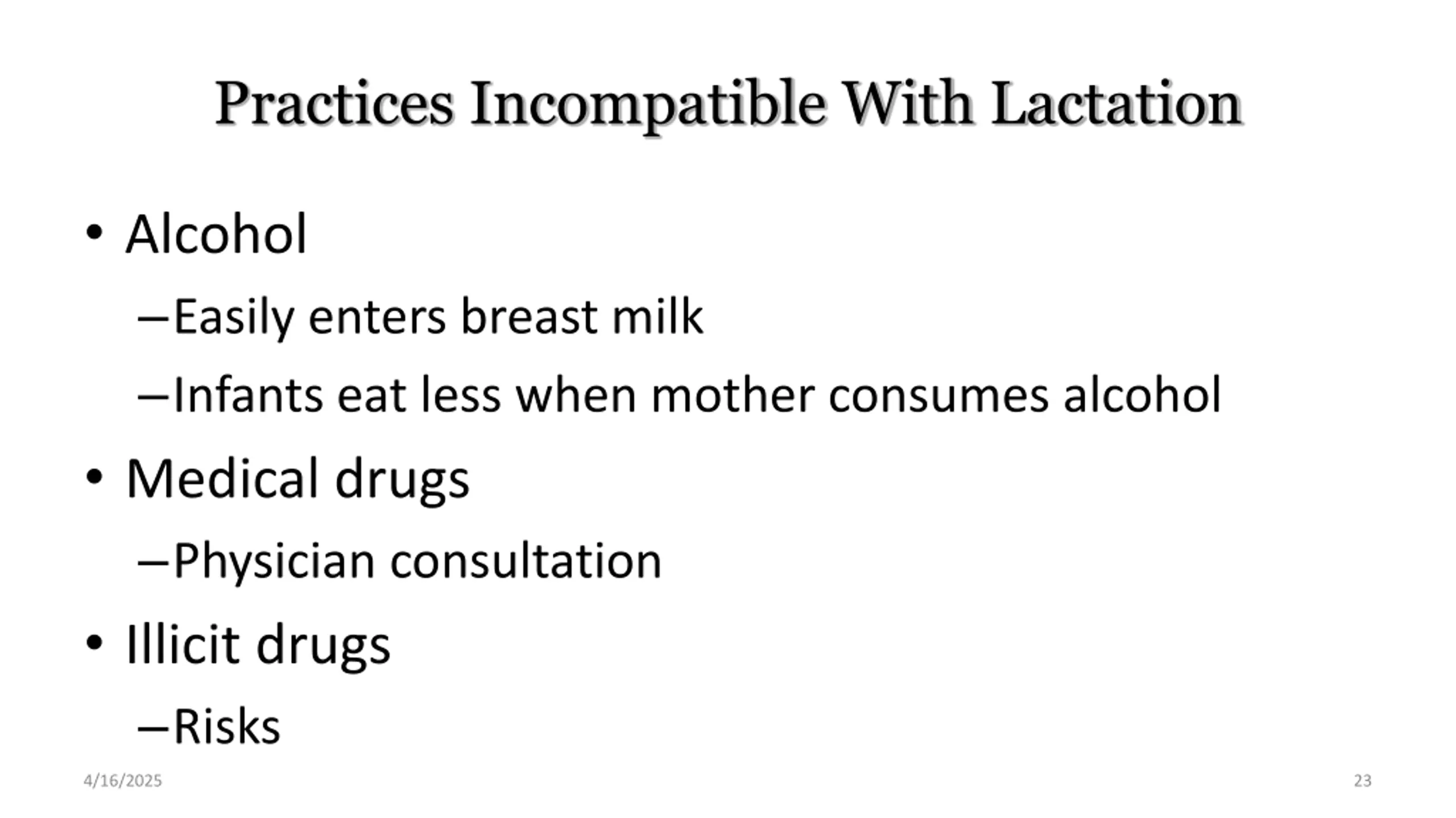 Practices Incompatible With Lactation Alcohol Easily enters breast milk Infants eat less when mother consumes alcohol Medical drugs Physician consultation Illicit drugs Risks 4/16/2025 23