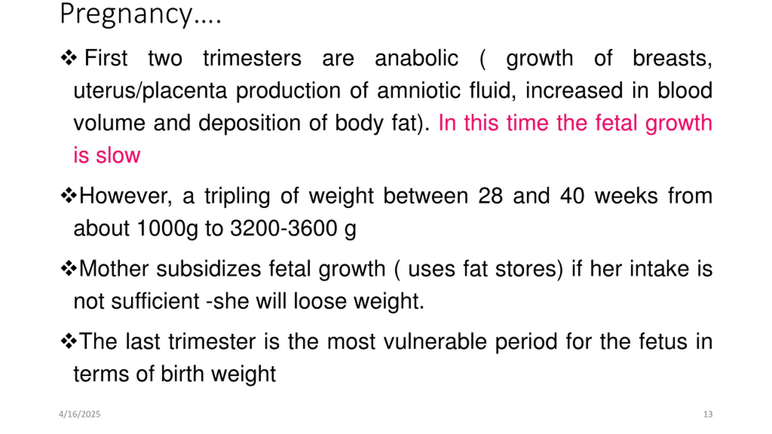 Pregnancy. First two trimesters are anabolic ( growth of breasts, uterus/placenta production of amniotic fluid, increased in blood volume and deposition of body fat). In this time the fetal growth is slow However, a tripling of weight between 28 and 40 weeks from about 1000g to 3200-3600 g Mother subsidizes fetal growth ( uses fat stores) if her intake is not sufficient -she will loose weight. The last trimester is the most vulnerable period for the fetus in terms of birth weight 4/16/2025 13