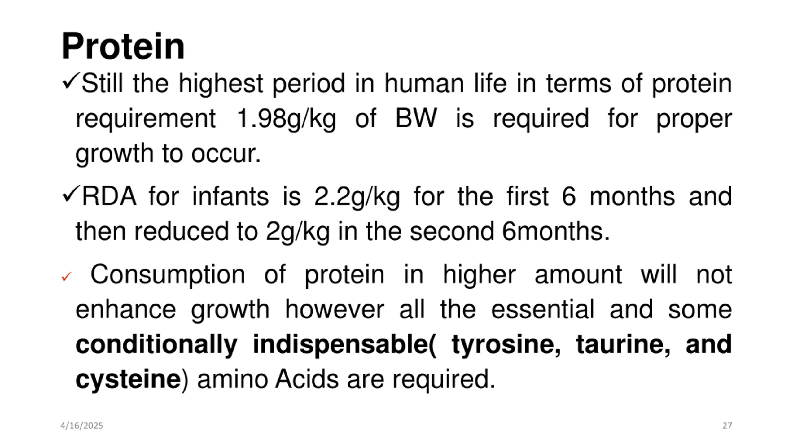 Protein Still the highest period in human life in terms of protein requirement1.98g/kg of BW is required for proper growth to occur. RDA for infants is 2.2g/kg for the first 6 months and then reduced to 2g/kg in the second 6months. Consumption of protein in higher amount will not enhance growth however all the essential and some conditionally indispensable( tyrosine, taurine, and cysteine) amino Acids are required. 4/16/2025 27