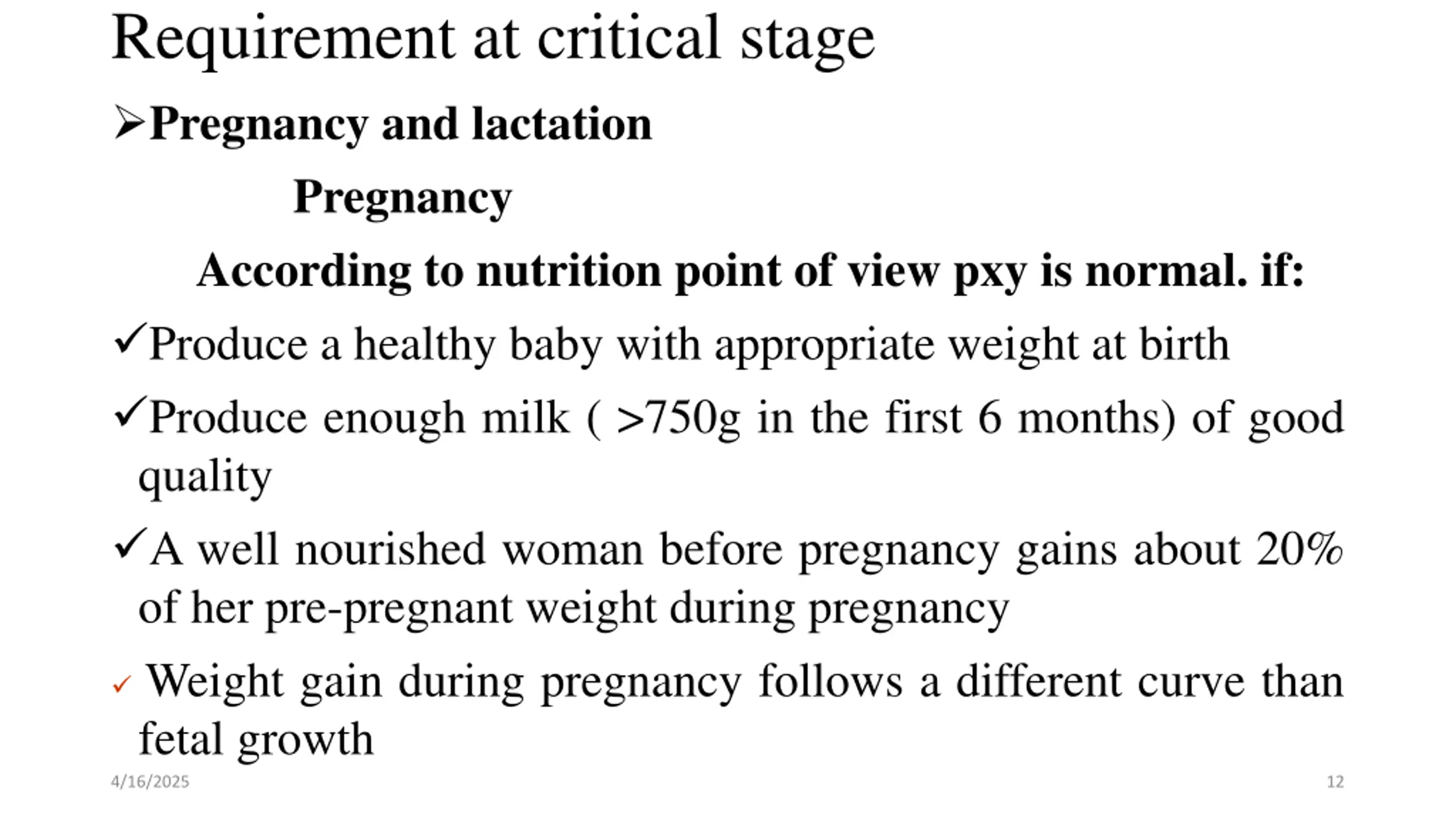 Requirement at critical stage Pregnancy and lactation Pregnancy According to nutrition point of view pxy is normal. if: Produce a healthy baby with appropriate weight at birth Produce enough milk ( >750g in the first 6 months) of good quality A well nourished woman before pregnancy gains about 20% of her pre-pregnant weight during pregnancy Weight gain during pregnancy follows a different curve than fetal growth 4/16/2025 12