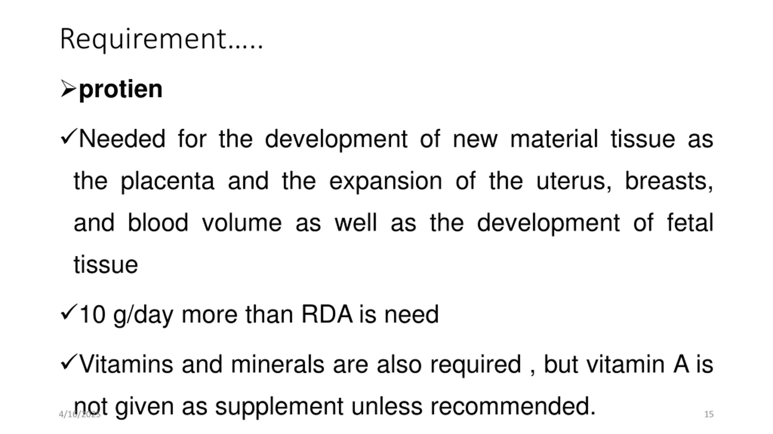 Requirement.. protien Needed for the development of new material tissue as the placenta and the expansion of the uterus, breasts, and blood volume as well as the development of fetal tissue 10 g/day more than RDA is need Vitamins and minerals are also required , but vitamin A is not given as supplement unless recommended. 4/16/2025 15