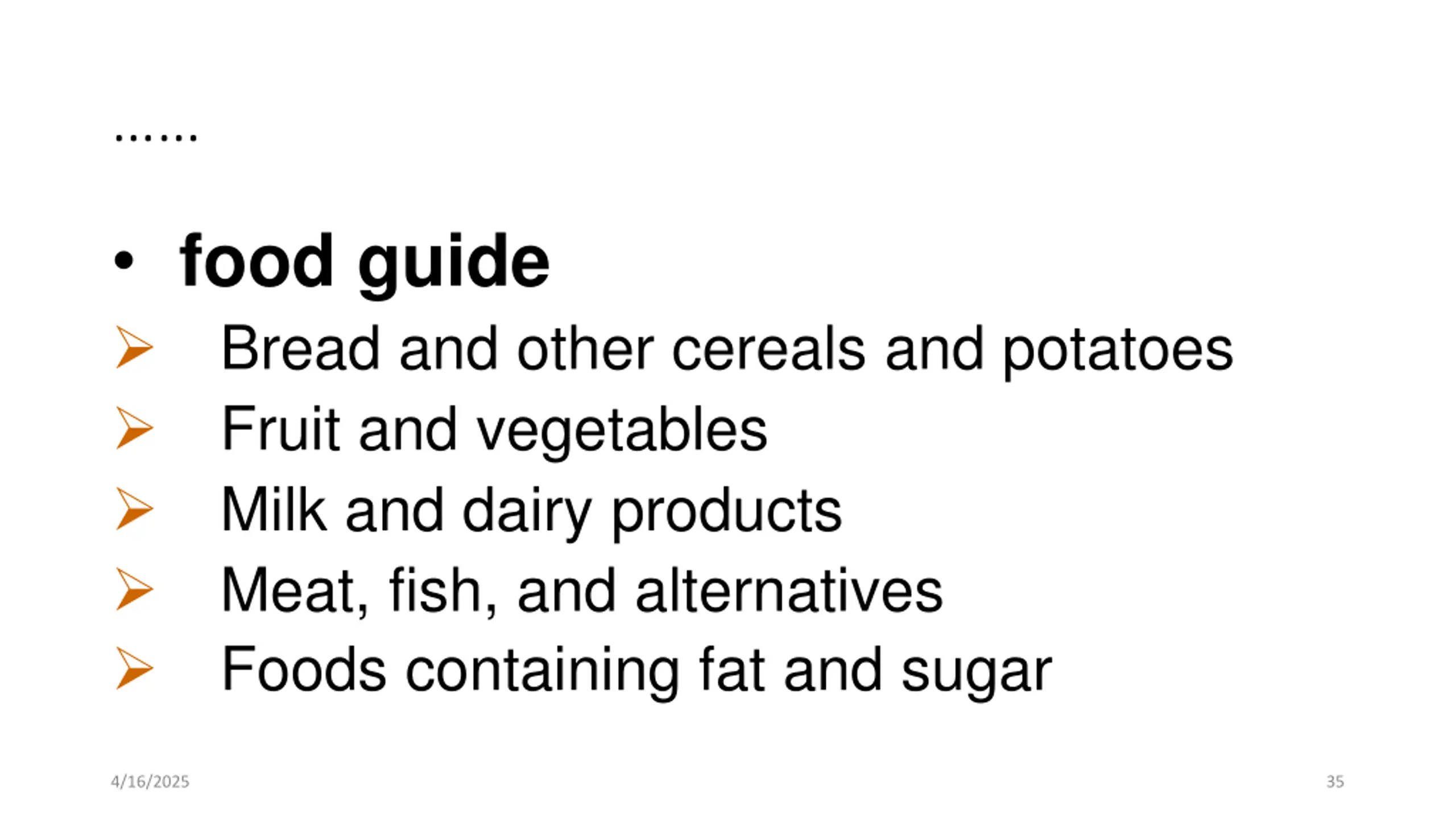 food guide Bread and other cereals and potatoes Fruit and vegetables Milk and dairy products Meat, fish, and alternatives Foods containing fat and sugar 4/16/2025 35