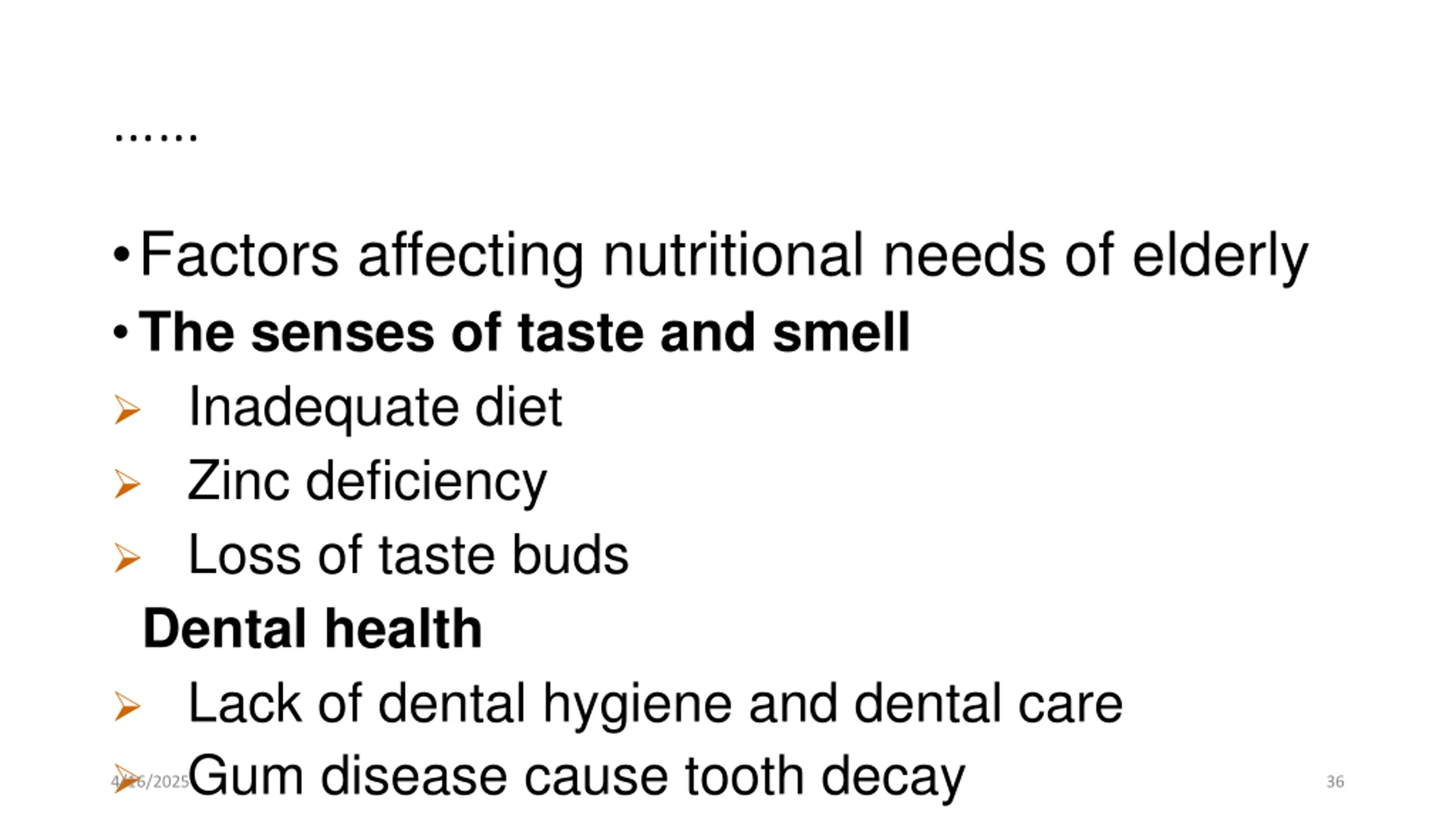 Factors affecting nutritional needs of elderly The senses of taste and smell Inadequate diet Zinc deficiency Loss of taste buds Dental health Lack of dental hygiene and dental care Gum disease cause tooth decay 4/16/2025 36