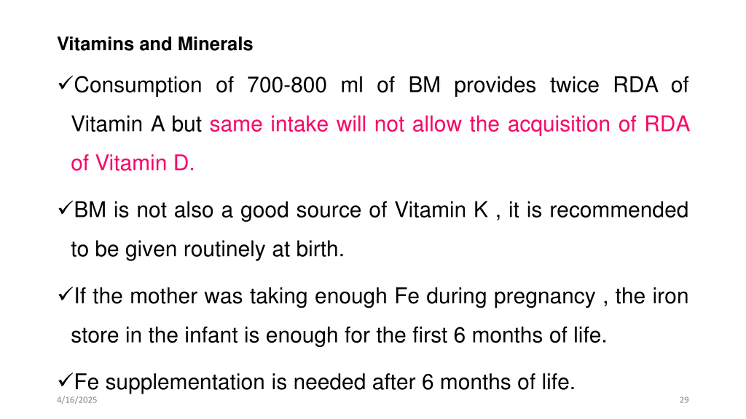 Vitamins and Minerals Consumption of 700-800 ml of BM provides twice RDA of Vitamin A but same intake will not allow the acquisition of RDA of Vitamin D. BM is not also a good source of Vitamin K , it is recommended to be given routinely at birth. If the mother was taking enough Fe during pregnancy , the iron store in the infant is enough for the first 6 months of life. Fe supplementation is needed after 6 months of life. 4/16/2025 29