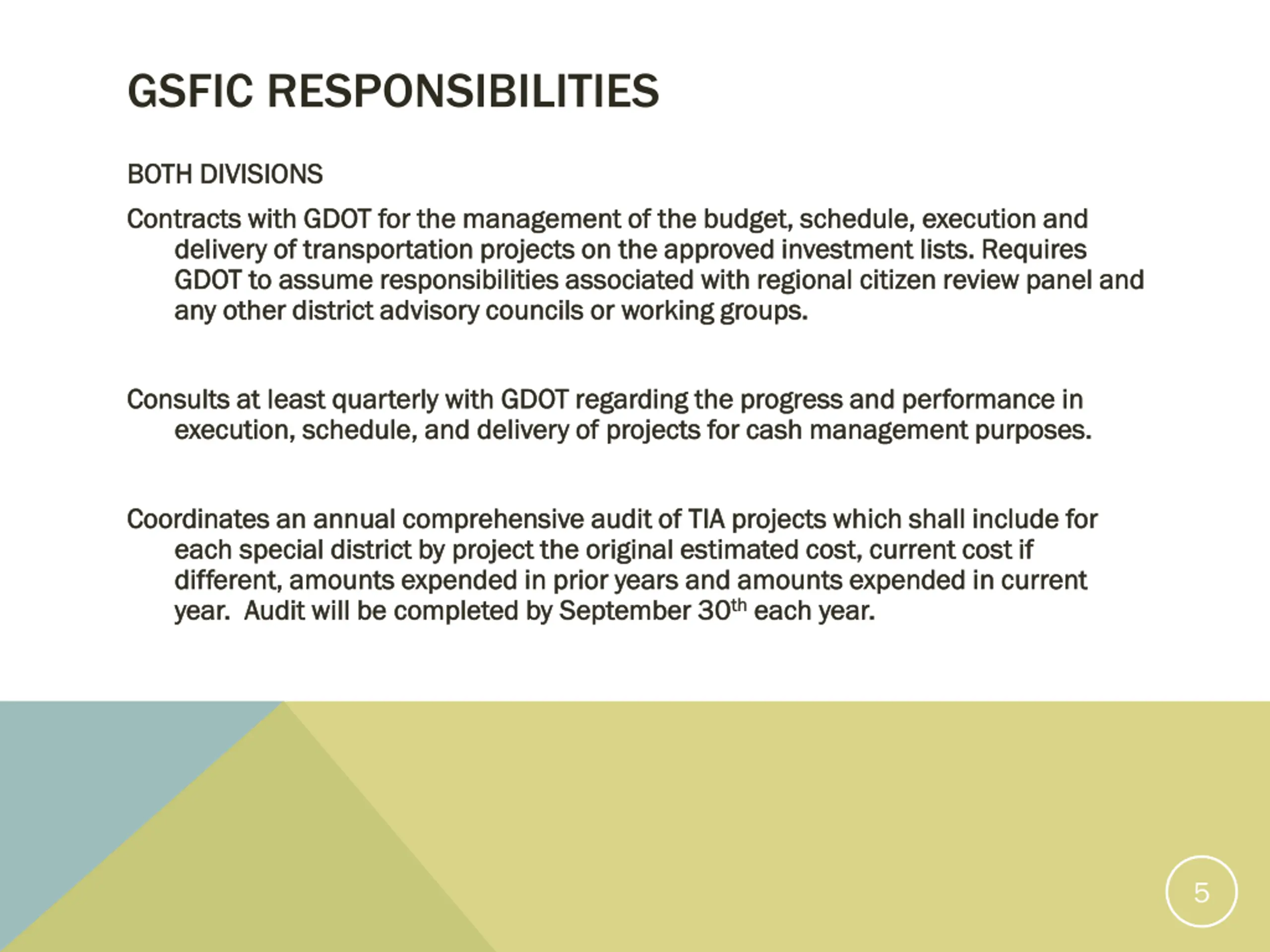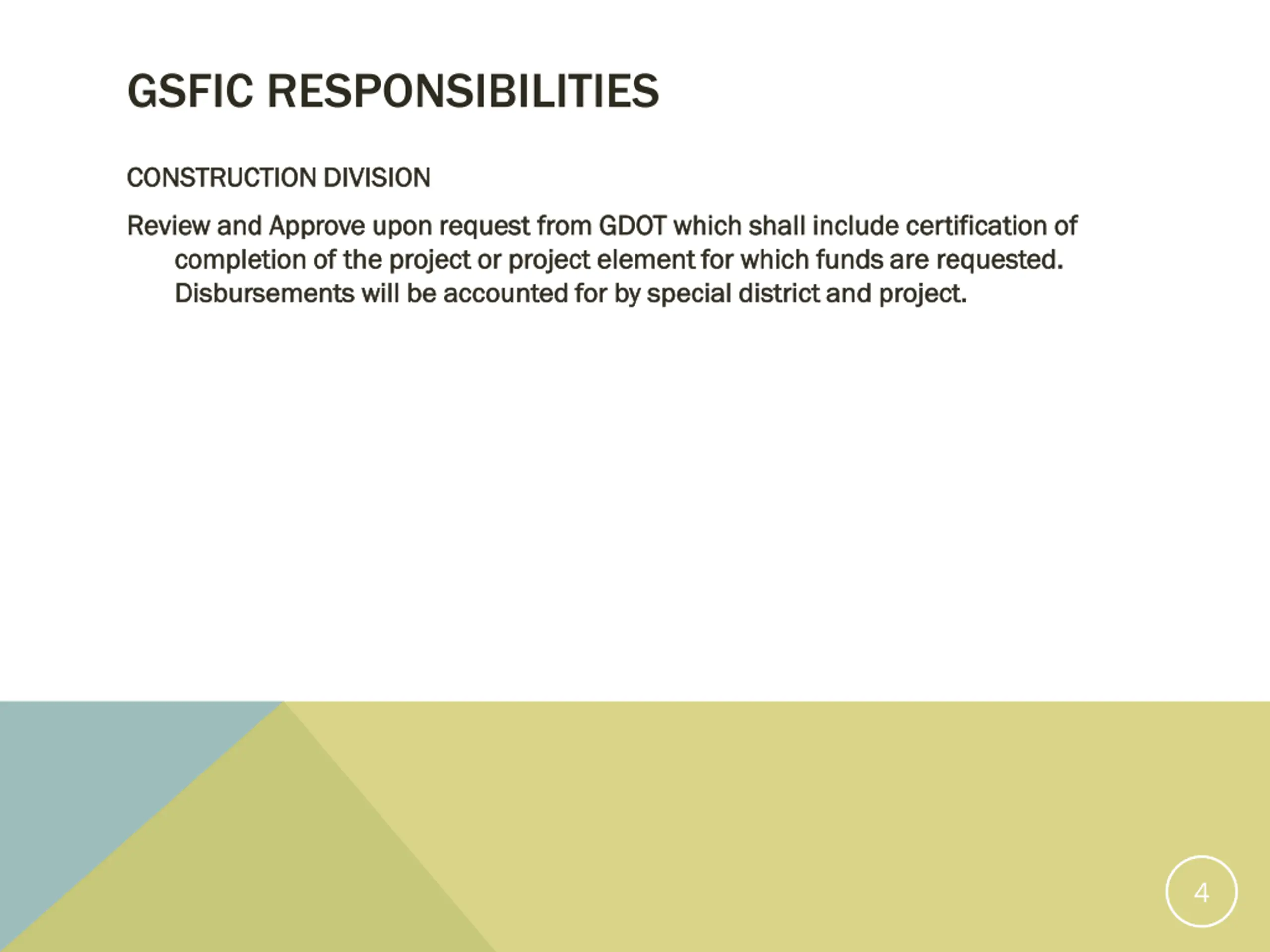 GSFIC RESPONSIBILITIES CONSTRUCTION DIVISION CONSTRUCTION DIVISION Review and Approve upon request Review and Approve upon request from GDOT which shall include certification of from GDOT which shall include certification of completion of the project or project element for which funds are requested. completion of the project or project element for which funds are requested. Disbursements will be accounted for by special district and project. Disbursements will be accounted for by special district and project. 4