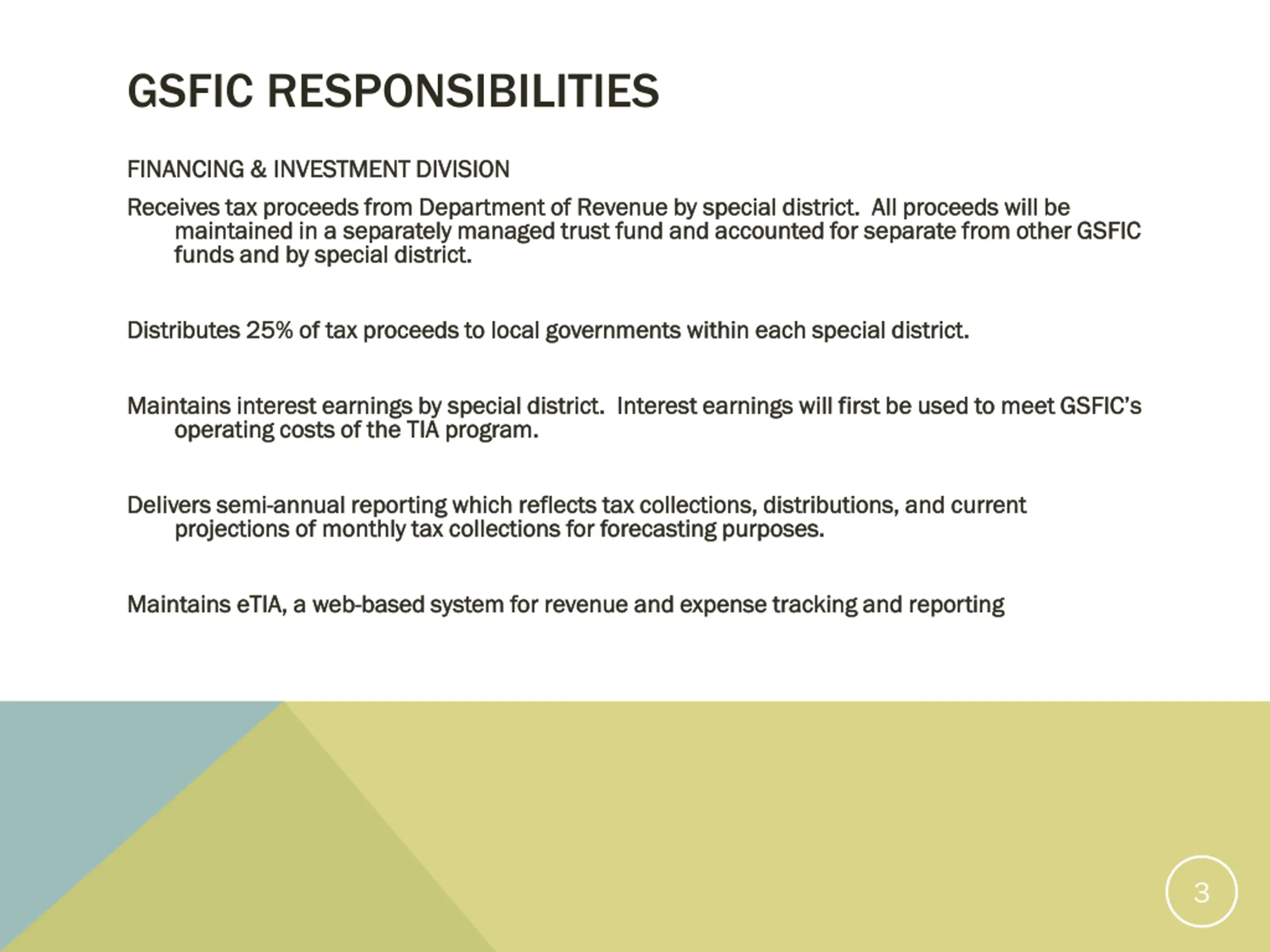 GSFIC RESPONSIBILITIES FINANCING & FINANCING & INVESTMENT DIVISION INVESTMENT DIVISION Receives tax proceeds from Department of Revenue by special district. All proceeds will be Receives tax proceeds from Department of Revenue by special district. All proceeds will be maintained in a separately managed trust fund and accounted for separate from other GSFIC maintained in a separately managed trust fund and accounted for separate from other GSFIC funds and by special district. funds and by special district. Distributes 25% of tax proceeds to local governments within each special district. Distributes 25% of tax proceeds to local governments within each special district. Maintains interest earnings by special district. Interest earnings will first be used to meet GSFIC s Maintains interest earnings by special district. Interest earnings will first be used to meet GSFIC s operating costs of the TIA operating costs of the TIA program. program. Delivers semi Delivers semi- -annual reporting which reflects tax collections, distributions, and current annual reporting which reflects tax collections, distributions, and current projections of monthly tax collections for forecasting purposes. projections of monthly tax collections for forecasting purposes. Maintains Maintains eTIA eTIA, a web , a web- -based system for revenue and expense tracking and reporting based system for revenue and expense tracking and reporting 3