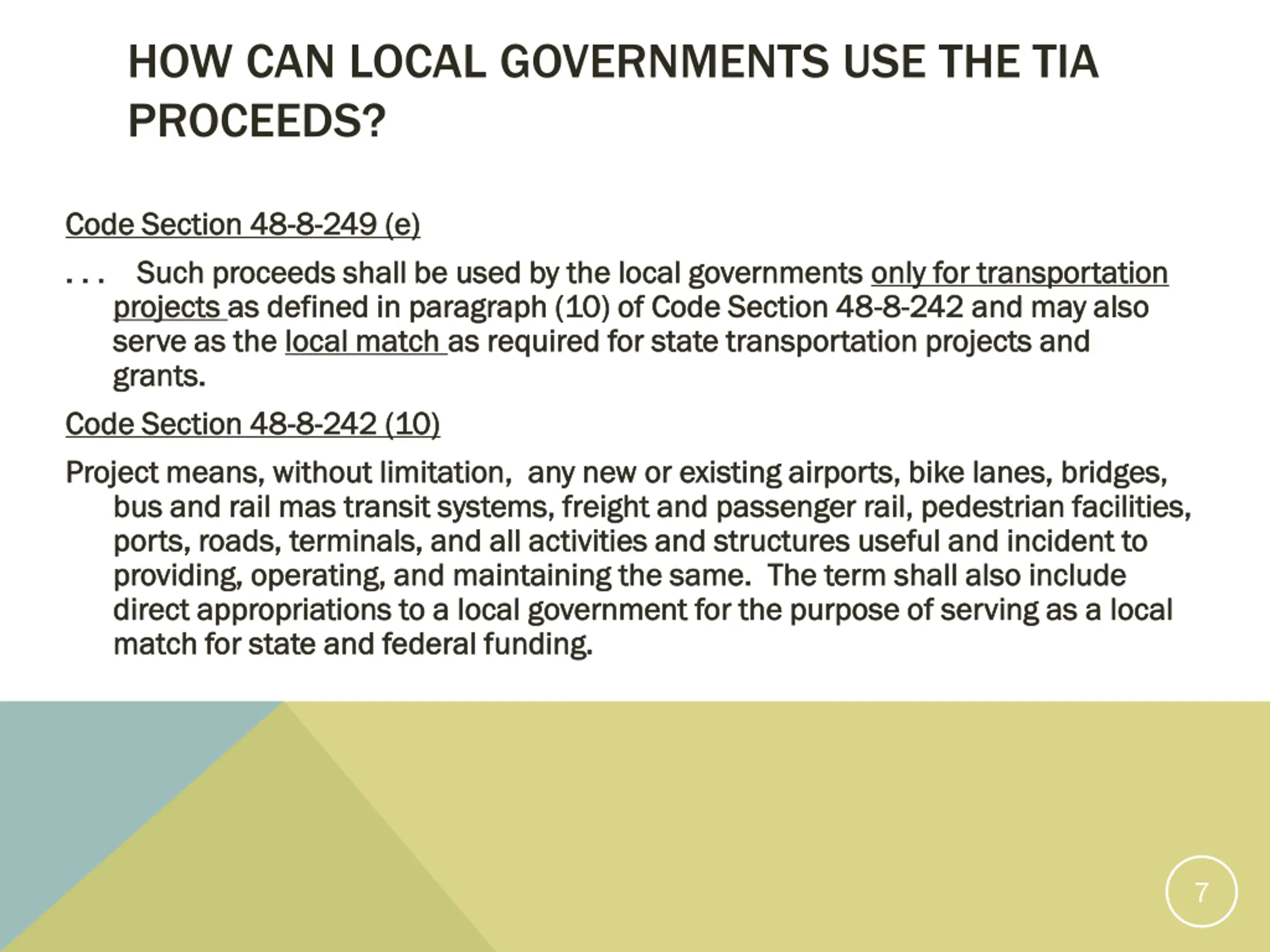 HOW CAN LOCAL GOVERNMENTS USE THE TIA PROCEEDS? Code Code Section 48 Section 48- -8 8- -249 (e) . . . . Such proceeds shall be used by the local governments . . Such proceeds shall be used by the local governments only for transportation projects projects as defined in paragraph (10) of Code Section 48 as defined in paragraph (10) of Code Section 48- -8 8- -242 and may also serve as the serve as the local match local match as required for state transportation projects and as required for state transportation projects and grants. grants. Code Section 48 Code Section 48- -8 8- -242 (10) 242 (10) Project means, without limitation, any new or existing airports, bike lanes, bridges, Project means, without limitation, any new or existing airports, bike lanes, bridges, bus and rail mas transit systems, freight and passenger rail, pedestrian facilities, bus and rail mas transit systems, freight and passenger rail, pedestrian facilities, ports, roads, terminals, and all activities and structures useful and incident to ports, roads, terminals, and all activities and structures useful and incident to providing, operating, and maintaining the same. The term shall also include providing, operating, and maintaining the same. The term shall also include direct appropriations to a local government for the purpose of serving as a local direct appropriations to a local government for the purpose of serving as a local match for state and federal funding. match for state and federal funding. 249 (e) only for transportation 242 and may also 7