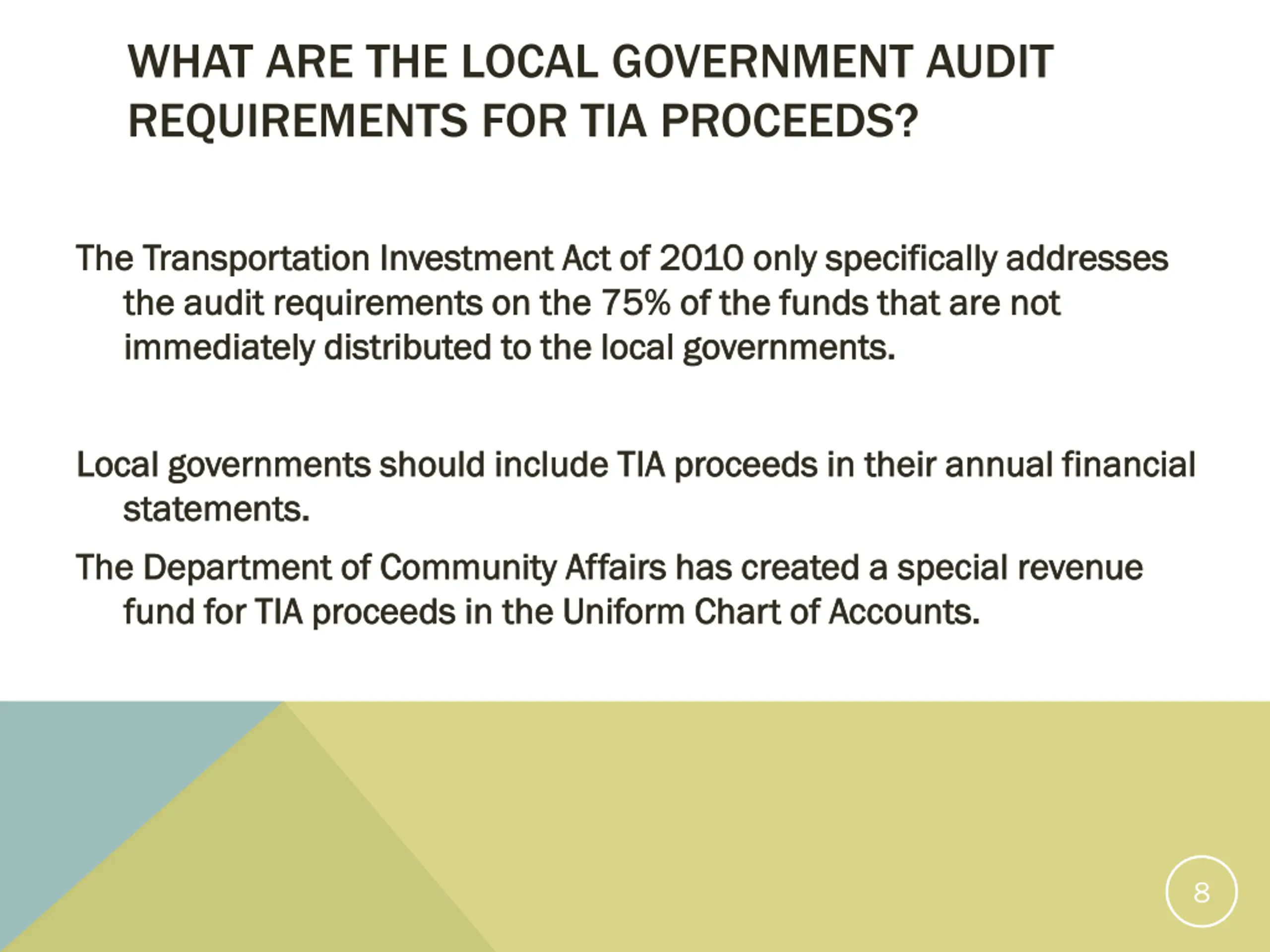 WHAT ARE THE LOCAL GOVERNMENT AUDIT REQUIREMENTS FOR TIA PROCEEDS? The The Transportation Investment Act of 2010 only specifically addresses Transportation Investment Act of 2010 only specifically addresses the audit requirements on the 75% of the funds that are not the audit requirements on the 75% of the funds that are not immediately distributed to the local governments. immediately distributed to the local governments. Local governments should include TIA proceeds in their annual financial Local governments should include TIA proceeds in their annual financial statements. statements. The Department of Community Affairs has created a special revenue The Department of Community Affairs has created a special revenue fund for TIA proceeds in the Uniform Chart of Accounts. fund for TIA proceeds in the Uniform Chart of Accounts. 8