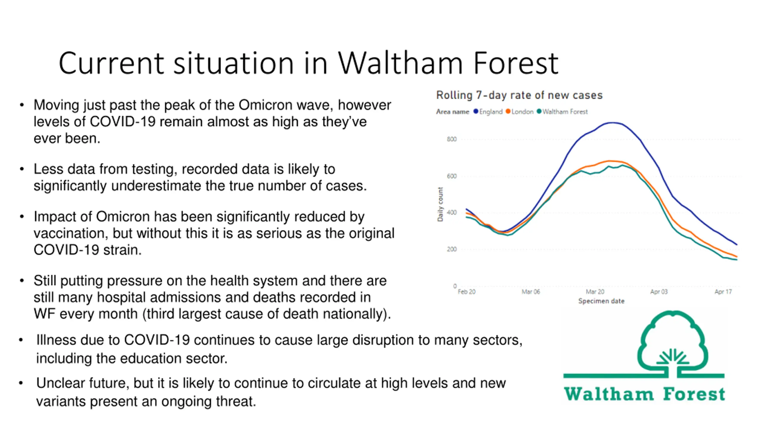 Current situation in Waltham Forest Moving just past the peak of the Omicron wave, however levels of COVID-19 remain almost as high as they ve ever been. Less data from testing, recorded data is likely to significantly underestimate the true number of cases. Impact of Omicron has been significantly reduced by vaccination, but without this it is as serious as the original COVID-19 strain. Still putting pressure on the health system and there are still many hospital admissions and deaths recorded in WF every month (third largest cause of death nationally). Illness due to COVID-19 continues to cause large disruption to many sectors, including the education sector. Unclear future, but it is likely to continue to circulate at high levels and new variants present an ongoing threat.