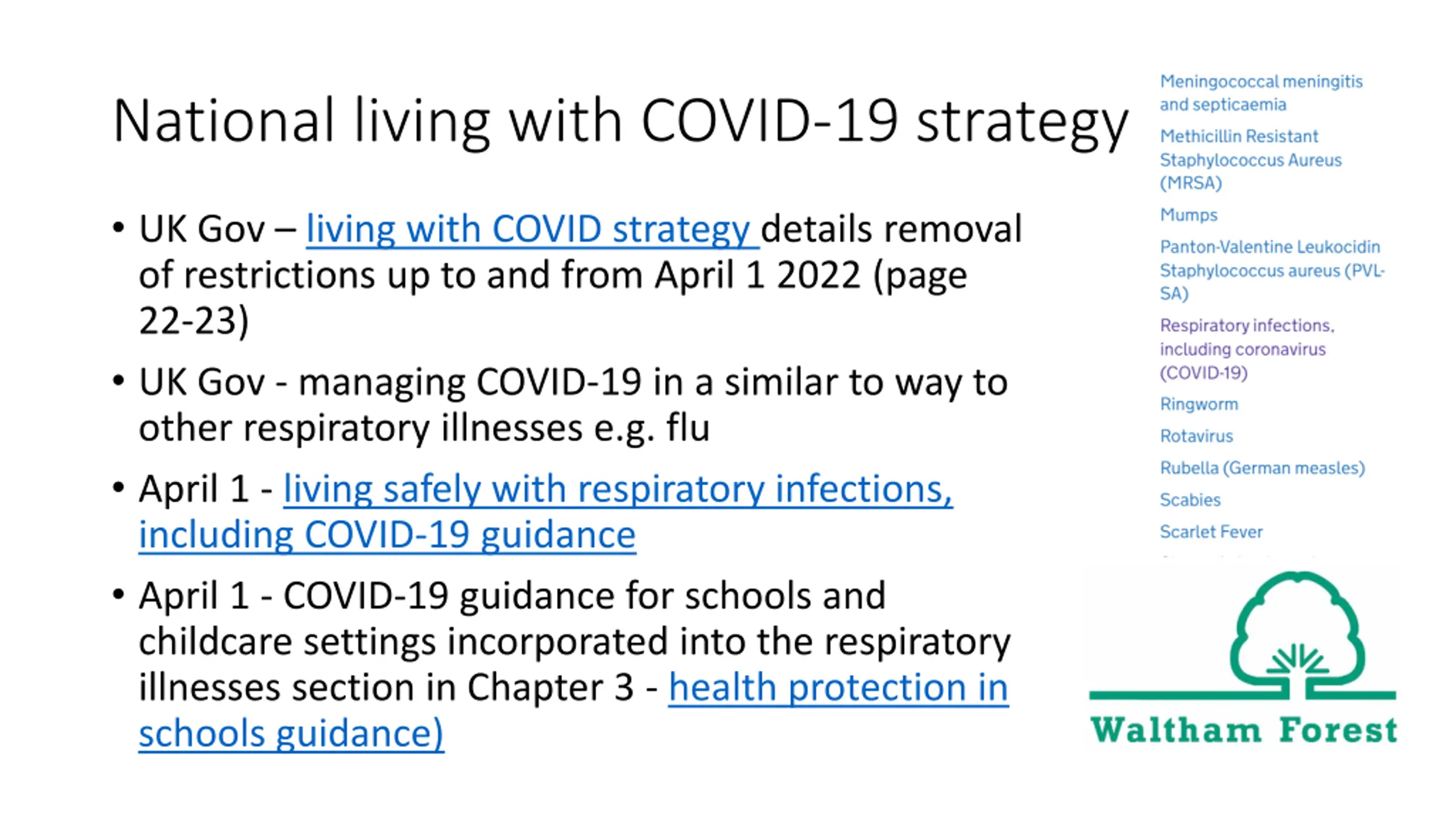 Webinar outline Current situation in Waltham Forest LBWF Changes to national policy what this means for schools and childcare settings - LBWF Changes to local policy what this means for schools and childcare settings LBWF Intro to UKHSA Managing cases of COVID-19 & other respiratory illnesses UKHSA Infection Prevention & Control measures - UKHSA Q&A