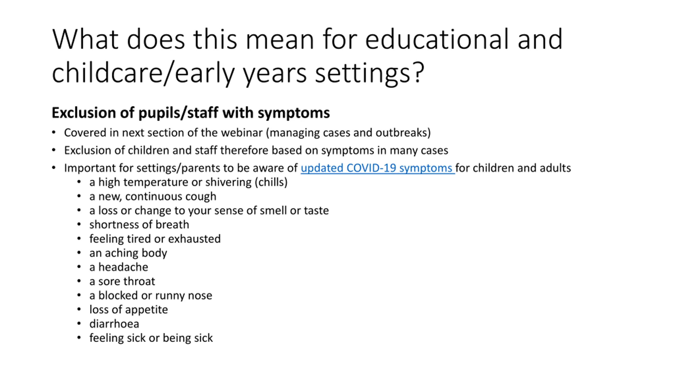 What does this mean for educational and childcare/early years settings? Exclusion of pupils/staff with symptoms Covered in next section of the webinar (managing cases and outbreaks) Exclusion of children and staff therefore based on symptoms in many cases Important for settings/parents to be aware of updated COVID-19 symptoms for children and adults a high temperature or shivering (chills) a new, continuous cough a loss or change to your sense of smell or taste shortness of breath feeling tired or exhausted an aching body a headache a sore throat a blocked or runny nose loss of appetite diarrhoea feeling sick or being sick