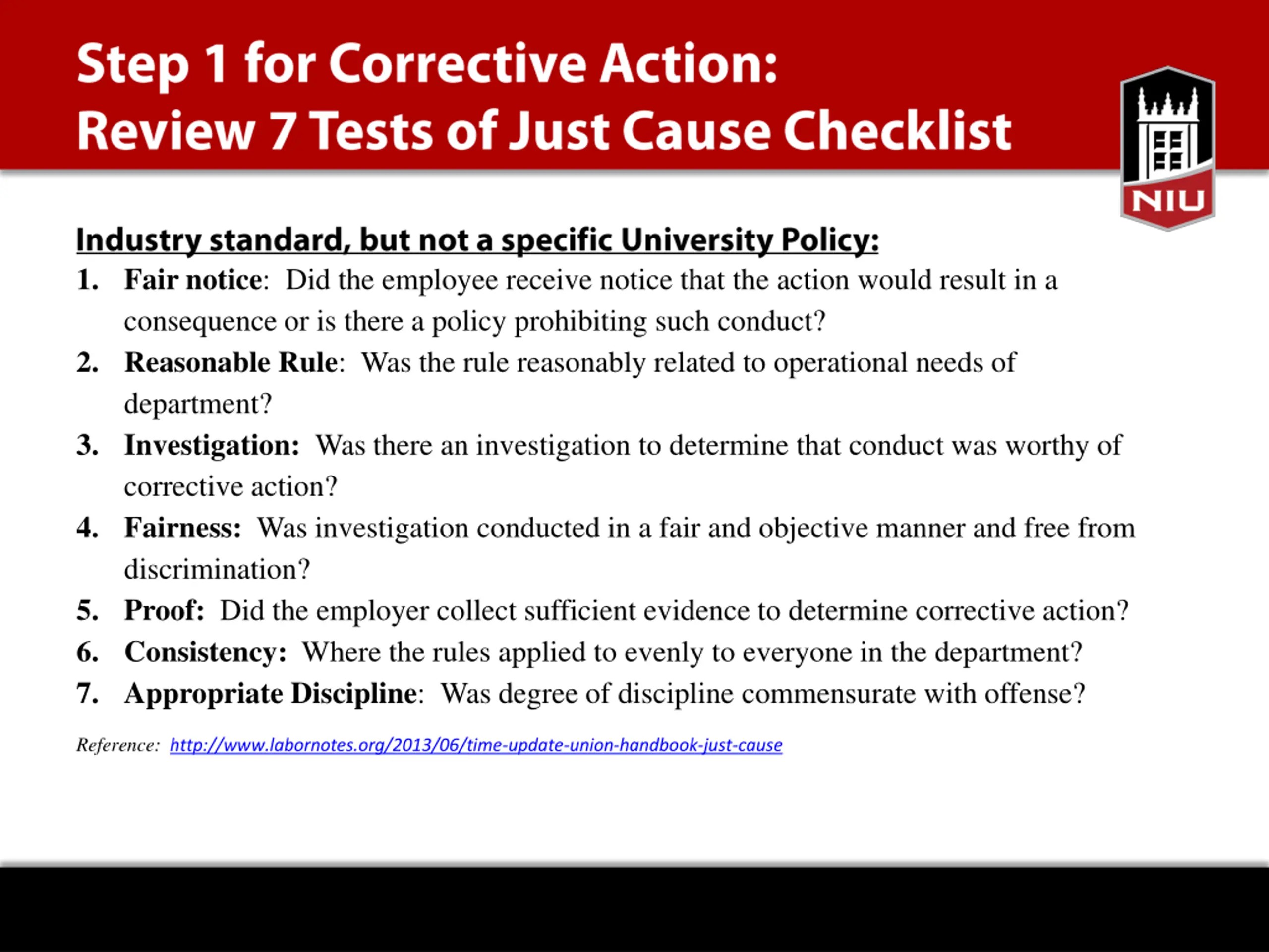 1. Fair notice: Did the employee receive notice that the action would result in a consequence or is there a policy prohibiting such conduct? 2. Reasonable Rule: Was the rule reasonably related to operational needs of department? 3. Investigation: Was there an investigation to determine that conduct was worthy of corrective action? 4. Fairness: Was investigation conducted in a fair and objective manner and free from discrimination? 5. Proof: Did the employer collect sufficient evidence to determine corrective action? 6. Consistency: Where the rules applied to evenly to everyone in the department? 7. Appropriate Discipline: Was degree of discipline commensurate with offense? Reference: http://www.labornotes.org/2013/06/time-update-union-handbook-just-cause