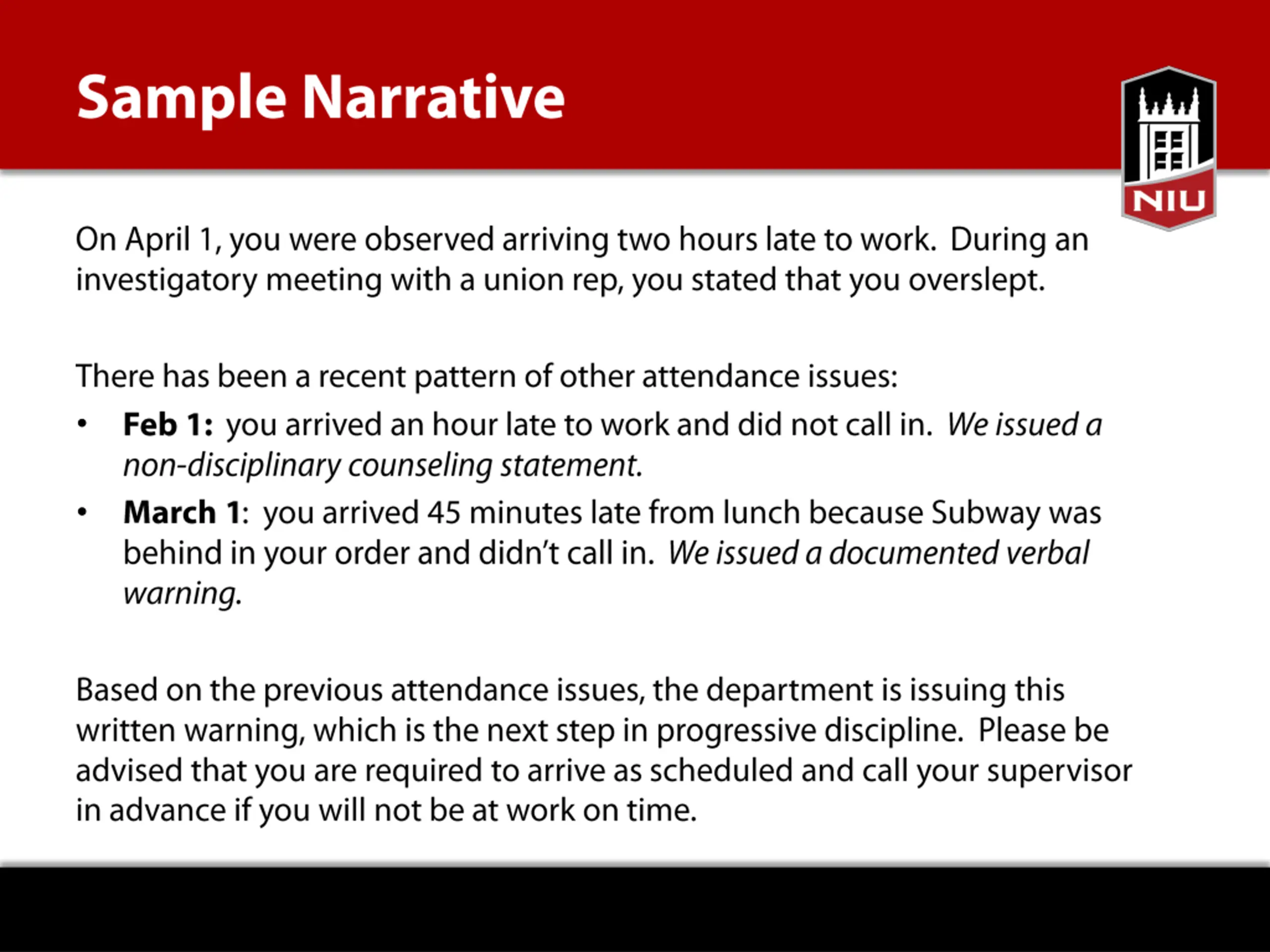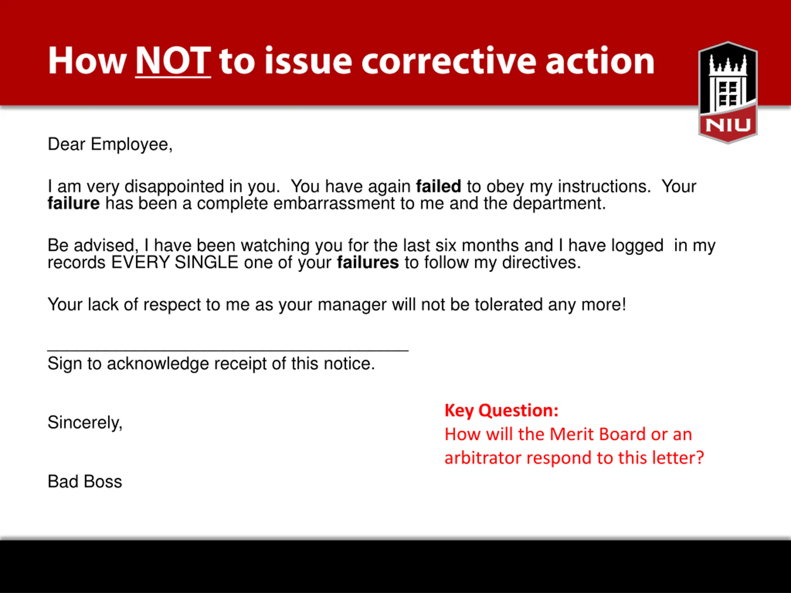 Dear Employee, I am very disappointed in you. You have again failed to obey my instructions. Your failure has been a complete embarrassment to me and the department. Be advised, I have been watching you for the last six months and I have logged in my records EVERY SINGLE one of your failures to follow my directives. Your lack of respect to me as your manager will not be tolerated any more! _____________________________________ Sign to acknowledge receipt of this notice. Key Question: How will the Merit Board or an arbitrator respond to this letter? Sincerely, Bad Boss