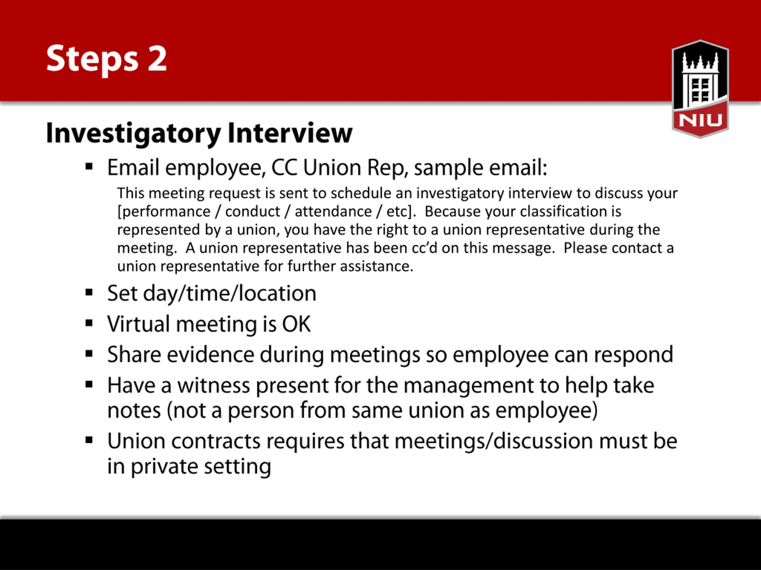 This meeting request is sent to schedule an investigatory interview to discuss your [performance / conduct / attendance / etc]. Because your classification is represented by a union, you have the right to a union representative during the meeting. A union representative has been cc d on this message. Please contact a union representative for further assistance.