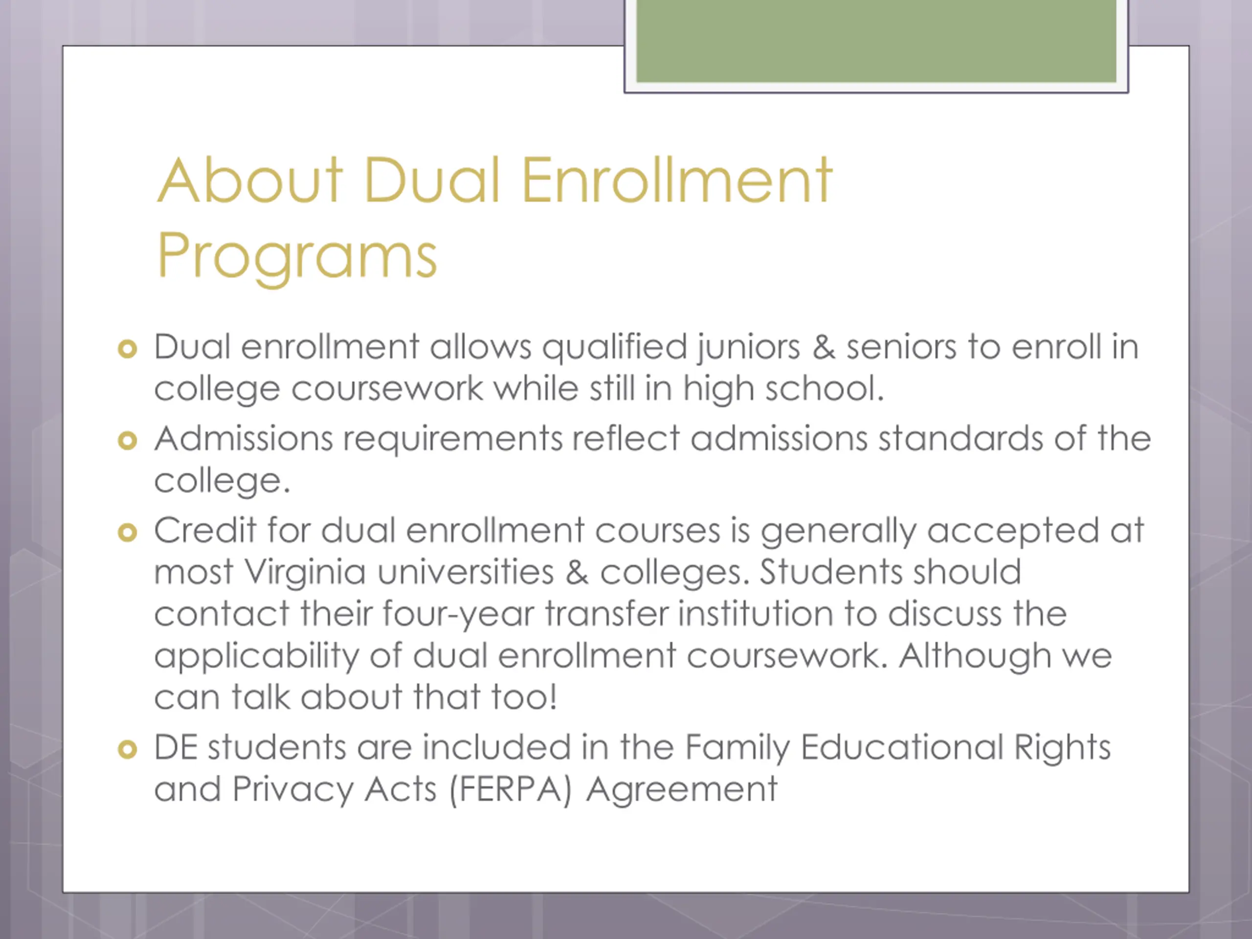About Dual Enrollment Programs Dual enrollment allows qualified juniors & seniors to enroll in college coursework while still in high school. Admissions requirements reflect admissions standards of the college. Credit for dual enrollment courses is generally accepted at most Virginia universities & colleges. Students should contact their four-year transfer institution to discuss the applicability of dual enrollment coursework. Although we can talk about that too! DE students are included in the Family Educational Rights and Privacy Acts (FERPA) Agreement