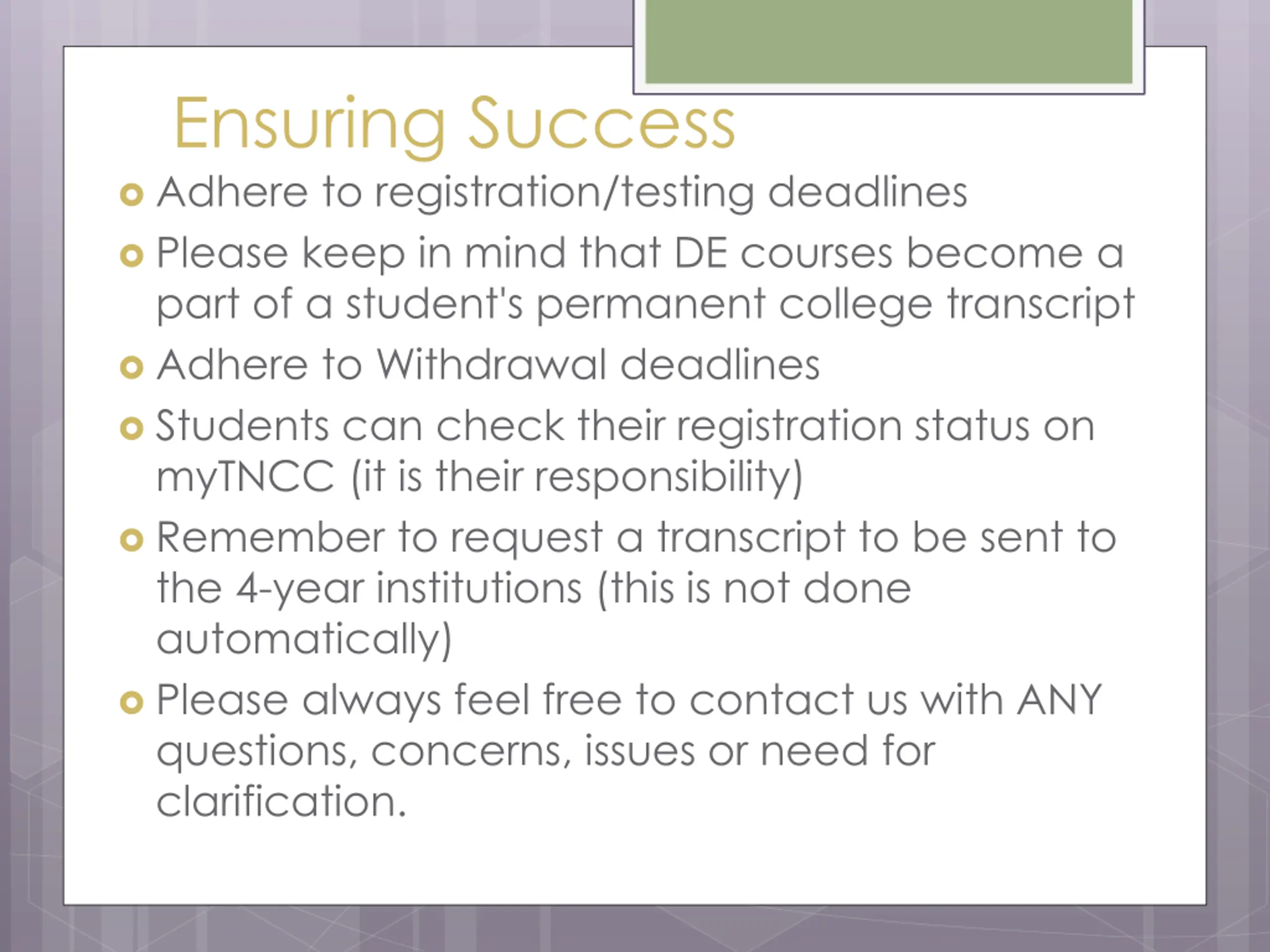 Ensuring Success Adhere to registration/testing deadlines Please keep in mind that DE courses become a part of a student's permanent college transcript Adhere to Withdrawal deadlines Students can check their registration status on myTNCC (it is their responsibility) Remember to request a transcript to be sent to the 4-year institutions (this is not done automatically) Please always feel free to contact us with ANY questions, concerns, issues or need for clarification.