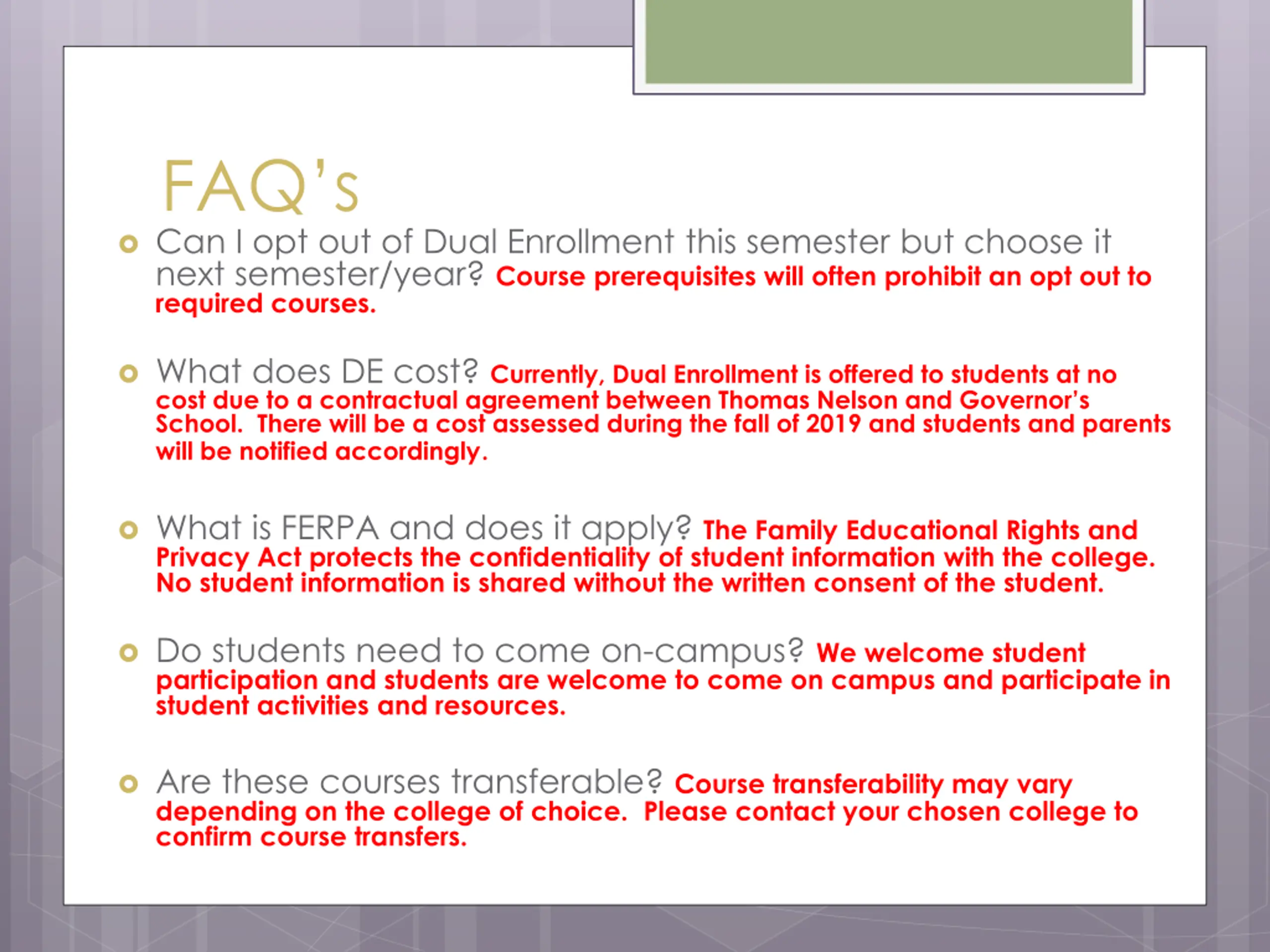 FAQs Can I opt out of Dual Enrollment this semester but choose it next semester/year? Course prerequisites will often prohibit an opt out to required courses. What does DE cost? Currently, Dual Enrollment is offered to students at no cost due to a contractual agreement between Thomas Nelson and Governor s School. There will be a cost assessed during the fall of 2019 and students and parents will be notified accordingly. What is FERPA and does it apply? The Family Educational Rights and Privacy Act protects the confidentiality of student information with the college. No student information is shared without the written consent of the student. Do students need to come on-campus? We welcome student participation and students are welcome to come on campus and participate in student activities and resources. Are these courses transferable? Course transferability may vary depending on the college of choice. Please contact your chosen college to confirm course transfers.