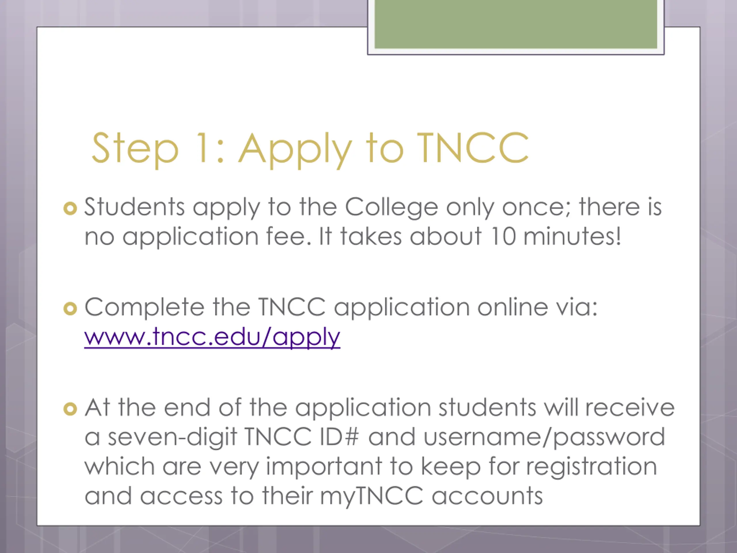 Step 1: Apply to TNCC Students apply to the College only once; there is no application fee. It takes about 10 minutes! Complete the TNCC application online via: www.tncc.edu/apply At the end of the application students will receive a seven-digit TNCC ID# and username/password which are very important to keep for registration and access to their myTNCC accounts