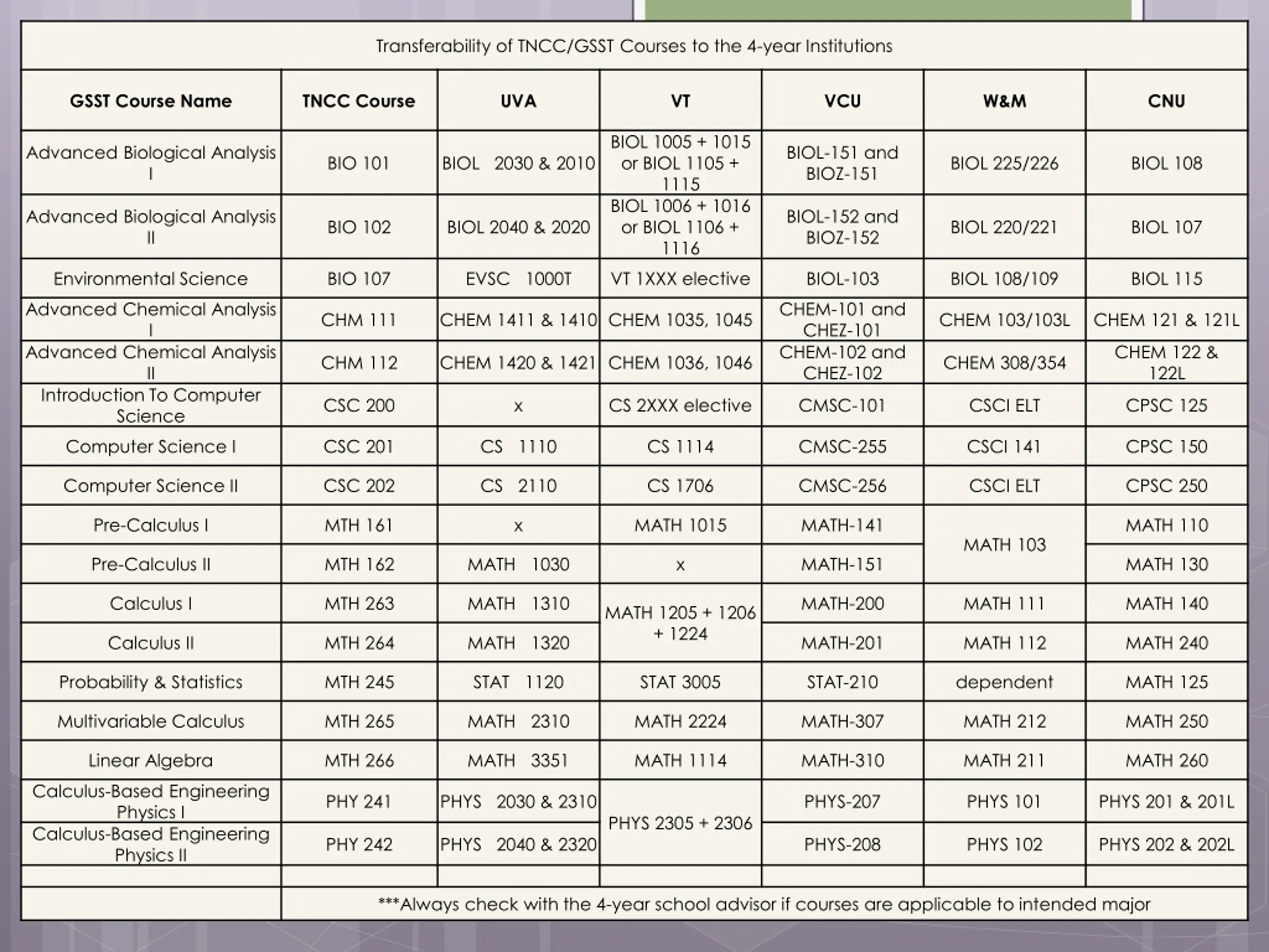 Transferability of TNCC/GSST Courses to the 4-year Institutions GSST Course Name TNCC Course UVA VT VCU W&M CNU BIOL 1005 + 1015 or BIOL 1105 + 1115 BIOL 1006 + 1016 or BIOL 1106 + 1116 Advanced Biological Analysis I BIOL-151 and BIOZ-151 BIO 101 BIOL 2030 & 2010 BIOL 225/226 BIOL 108 Advanced Biological Analysis II BIOL-152 and BIOZ-152 BIO 102 BIOL 2040 & 2020 BIOL 220/221 BIOL 107 Environmental Science BIO 107 EVSC 1000T VT 1XXX elective BIOL-103 BIOL 108/109 BIOL 115 Advanced Chemical Analysis I Advanced Chemical Analysis II Introduction To Computer Science CHEM-101 and CHEZ-101 CHEM-102 and CHEZ-102 CHM 111 CHEM 1411 & 1410 CHEM 1035, 1045 CHEM 103/103L CHEM 121 & 121L CHEM 122 & 122L CHM 112 CHEM 1420 & 1421 CHEM 1036, 1046 CHEM 308/354 CSC 200 x CS 2XXX elective CMSC-101 CSCI ELT CPSC 125 Computer Science I CSC 201 CS 1110 CS 1114 CMSC-255 CSCI 141 CPSC 150 Computer Science II CSC 202 CS 2110 CS 1706 CMSC-256 CSCI ELT CPSC 250 Pre-Calculus I MTH 161 x MATH 1015 MATH-141 MATH 110 MATH 103 Pre-Calculus II MTH 162 MATH 1030 x MATH-151 MATH 130 Calculus I MTH 263 MATH 1310 MATH-200 MATH 111 MATH 140 MATH 1205 + 1206 + 1224 Calculus II MTH 264 MATH 1320 MATH-201 MATH 112 MATH 240 Probability & Statistics MTH 245 STAT 1120 STAT 3005 STAT-210 dependent MATH 125 Multivariable Calculus MTH 265 MATH 2310 MATH 2224 MATH-307 MATH 212 MATH 250 Linear Algebra MTH 266 MATH 3351 MATH 1114 MATH-310 MATH 211 MATH 260 Calculus-Based Engineering Physics I Calculus-Based Engineering Physics II PHY 241 PHYS 2030 & 2310 PHYS-207 PHYS 101 PHYS 201 & 201L PHYS 2305 + 2306 PHY 242 PHYS 2040 & 2320 PHYS-208 PHYS 102 PHYS 202 & 202L ***Always check with the 4-year school advisor if courses are applicable to intended major