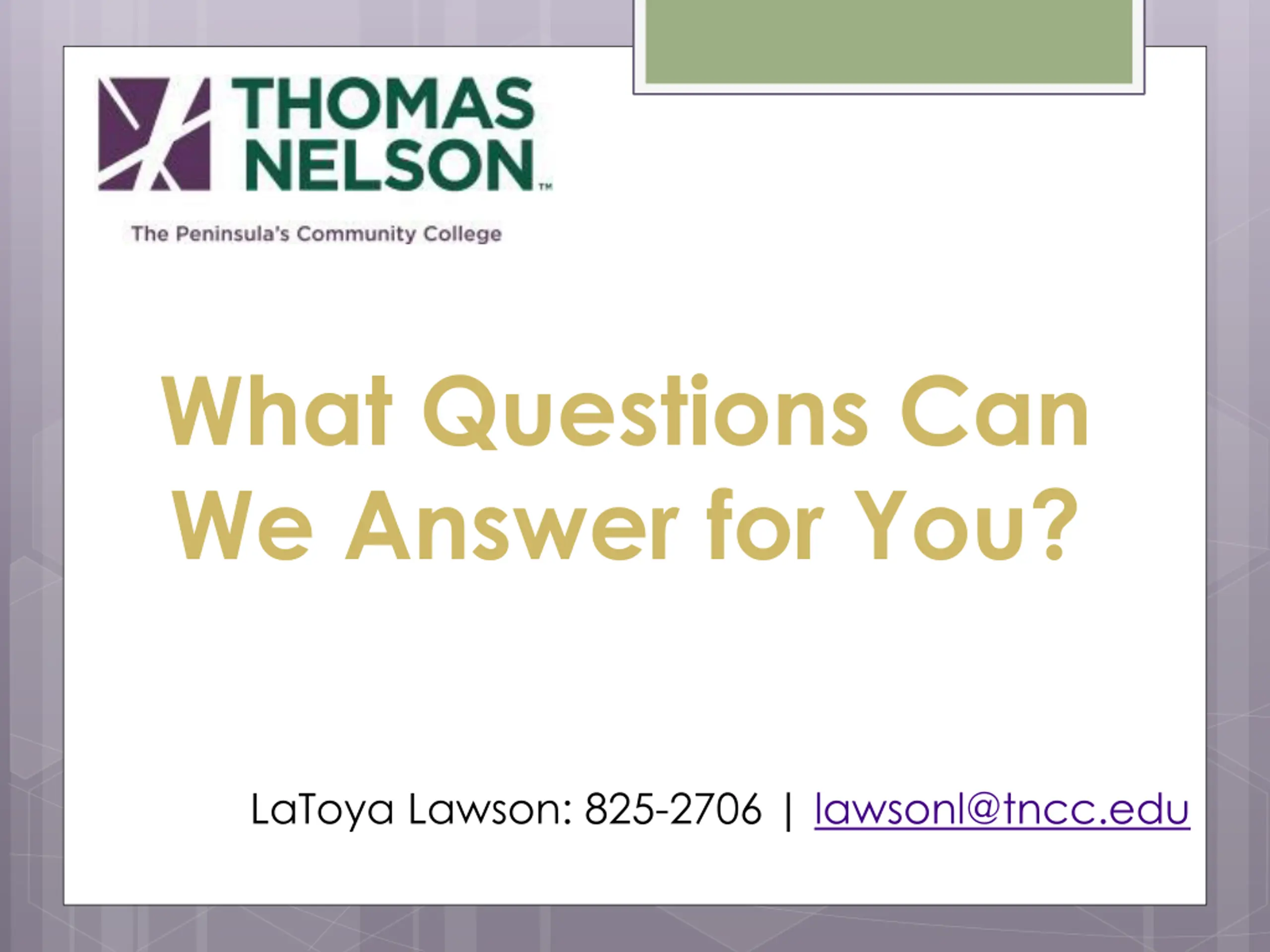 What Questions Can We Answer for You? LaToya Lawson: 825-2706 | lawsonl@tncc.edu