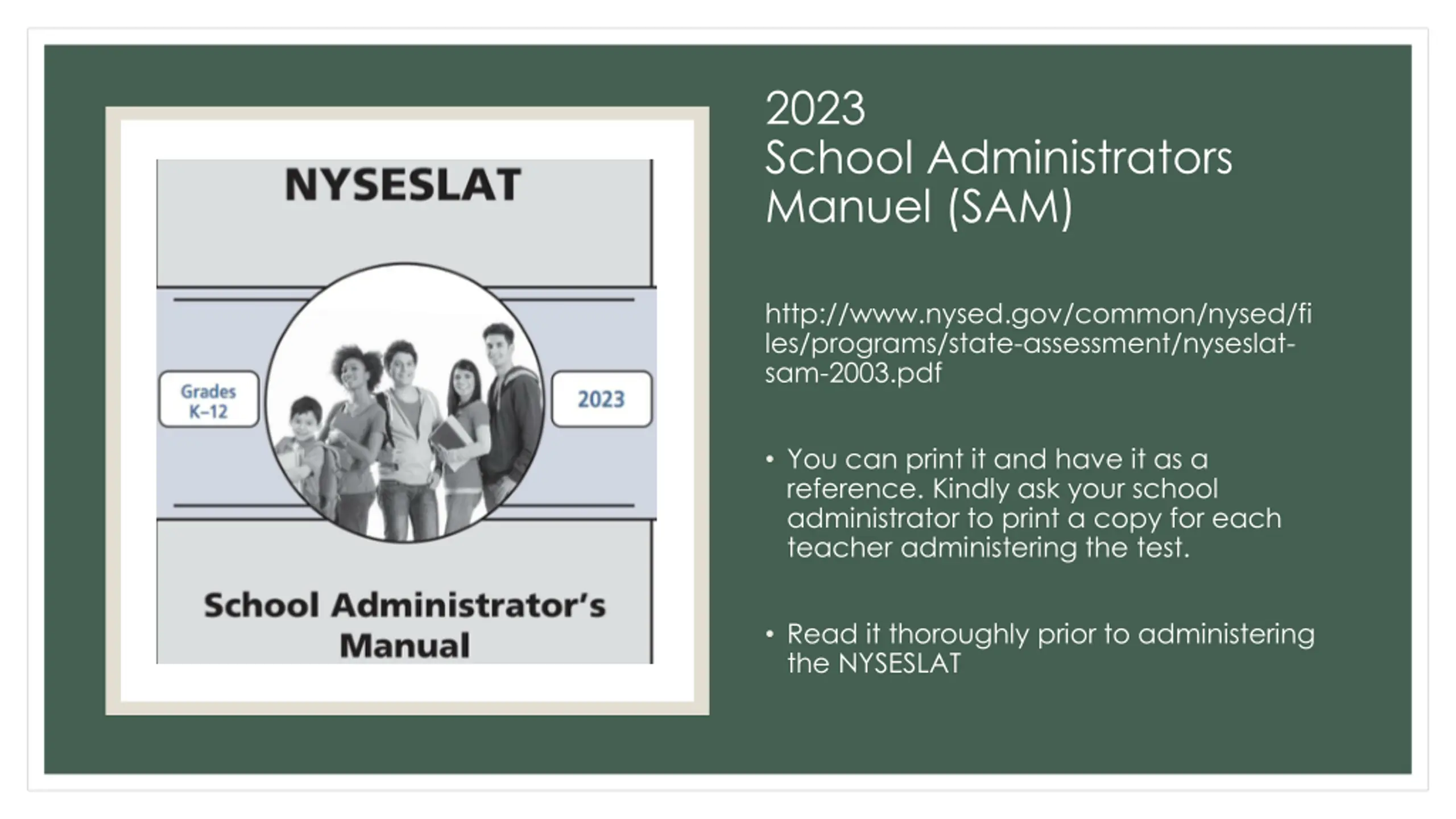 2023 School Administrators Manuel (SAM) http://www.nysed.gov/common/nysed/fi les/programs/state-assessment/nyseslat- sam-2003.pdf You can print it and have it as a reference. Kindly ask your school administrator to print a copy for each teacher administering the test. Read it thoroughly prior to administering the NYSESLAT