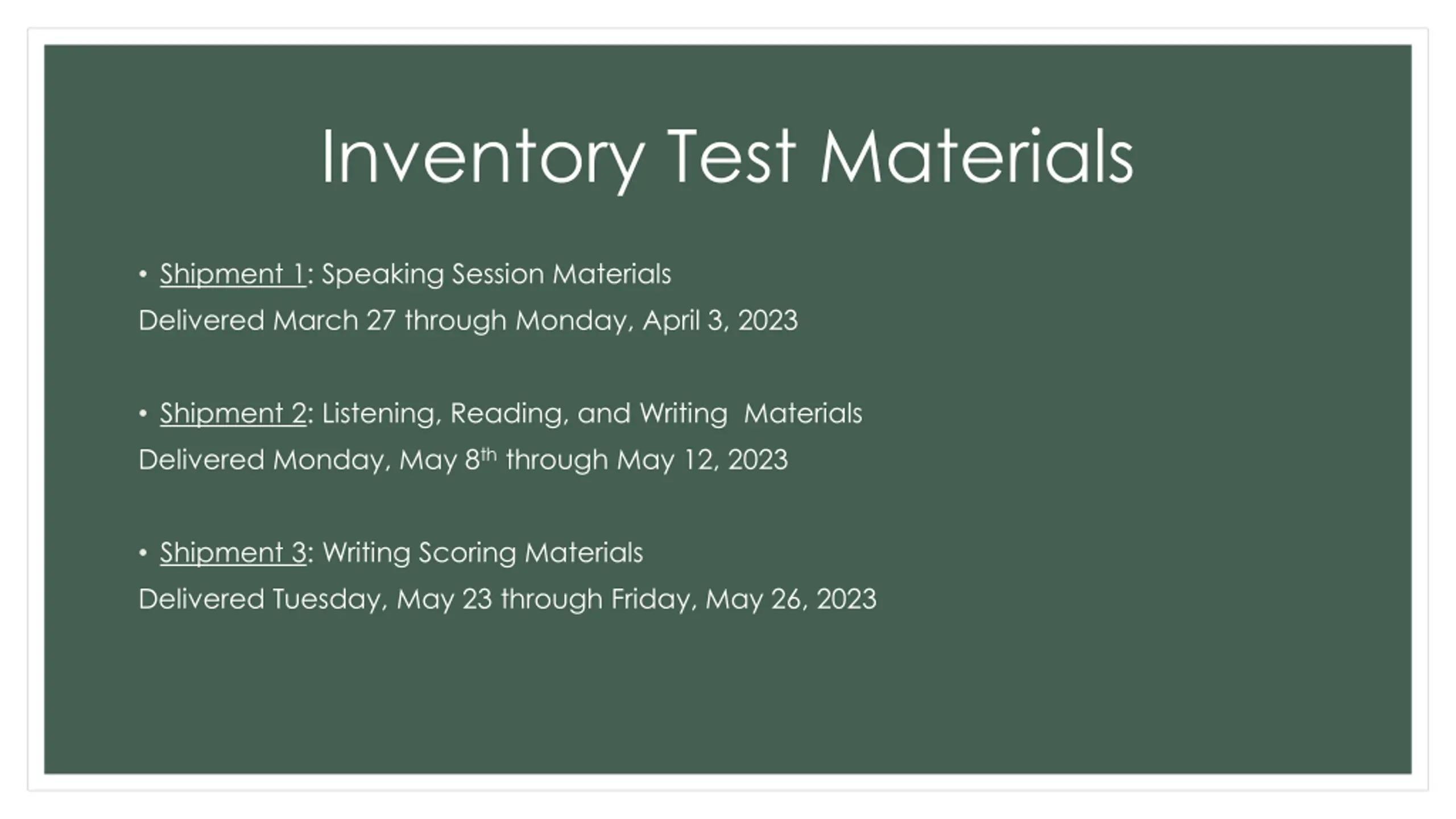 Inventory Test Materials Shipment 1: Speaking Session Materials Delivered March 27 through Monday, April 3, 2023 Shipment 2: Listening, Reading, and Writing Materials Delivered Monday, May 8ththrough May 12, 2023 Shipment 3: Writing Scoring Materials Delivered Tuesday, May 23 through Friday, May 26, 2023