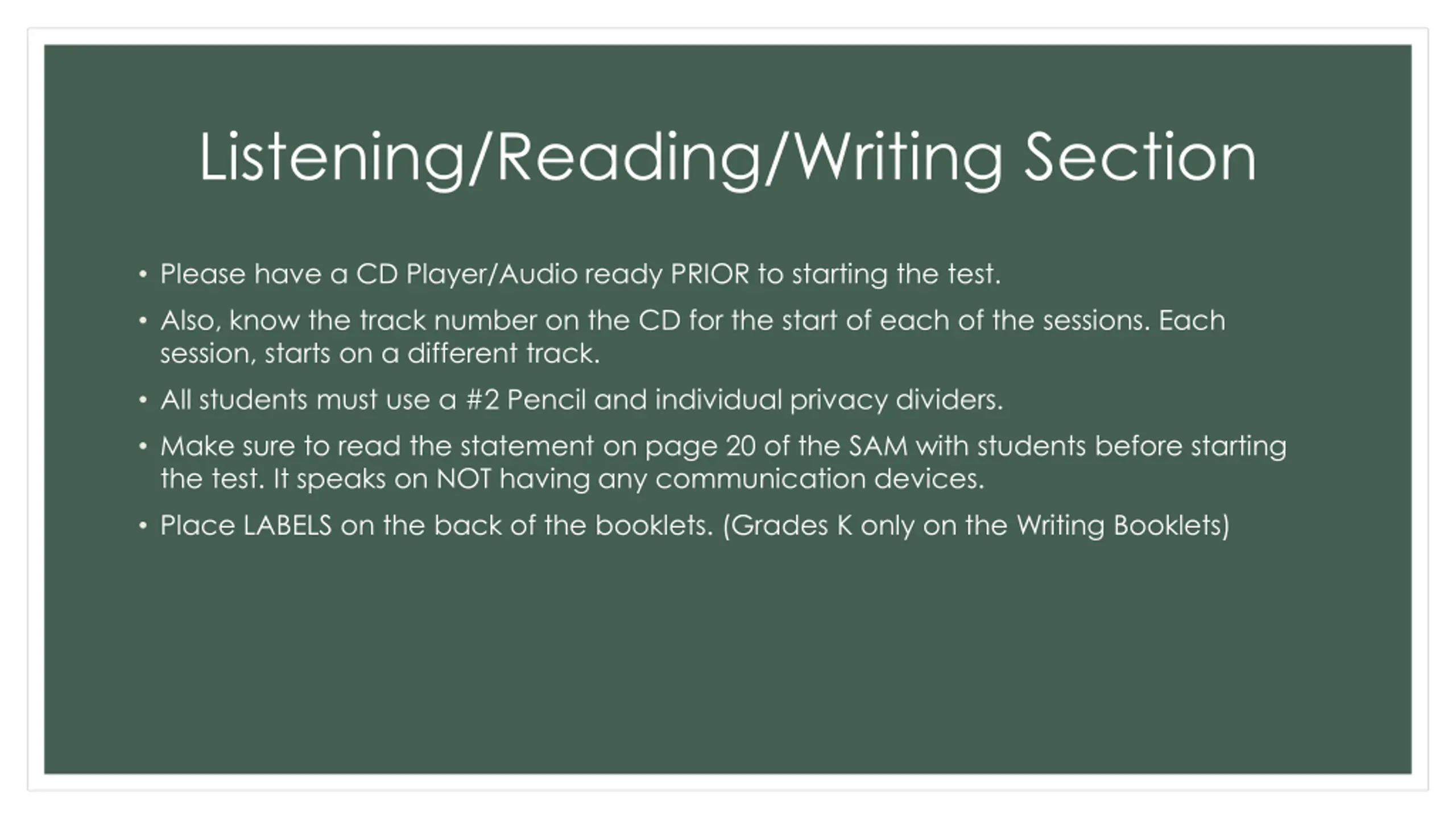Listening/Reading/Writing Section Please have a CD Player/Audio ready PRIOR to starting the test. Also, know the track number on the CD for the start of each of the sessions. Each session, starts on a different track. All students must use a #2 Pencil and individual privacy dividers. Make sure to read the statement on page 20 of the SAM with students before starting the test. It speaks on NOT having any communication devices. Place LABELS on the back of the booklets. (Grades K only on the Writing Booklets)