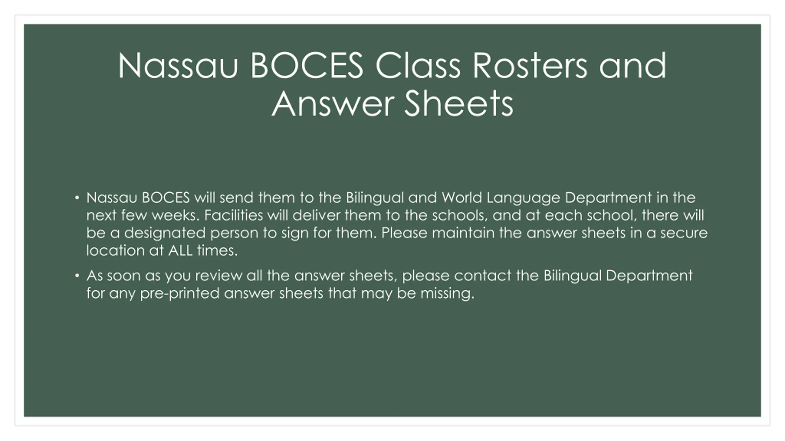 Nassau BOCES Class Rosters and Answer Sheets Nassau BOCES will send them to the Bilingual and World Language Department in the next few weeks. Facilities will deliver them to the schools, and at each school, there will be a designated person to sign for them. Please maintain the answer sheets in a secure location at ALL times. As soon as you review all the answer sheets, please contact the Bilingual Department for any pre-printed answer sheets that may be missing.