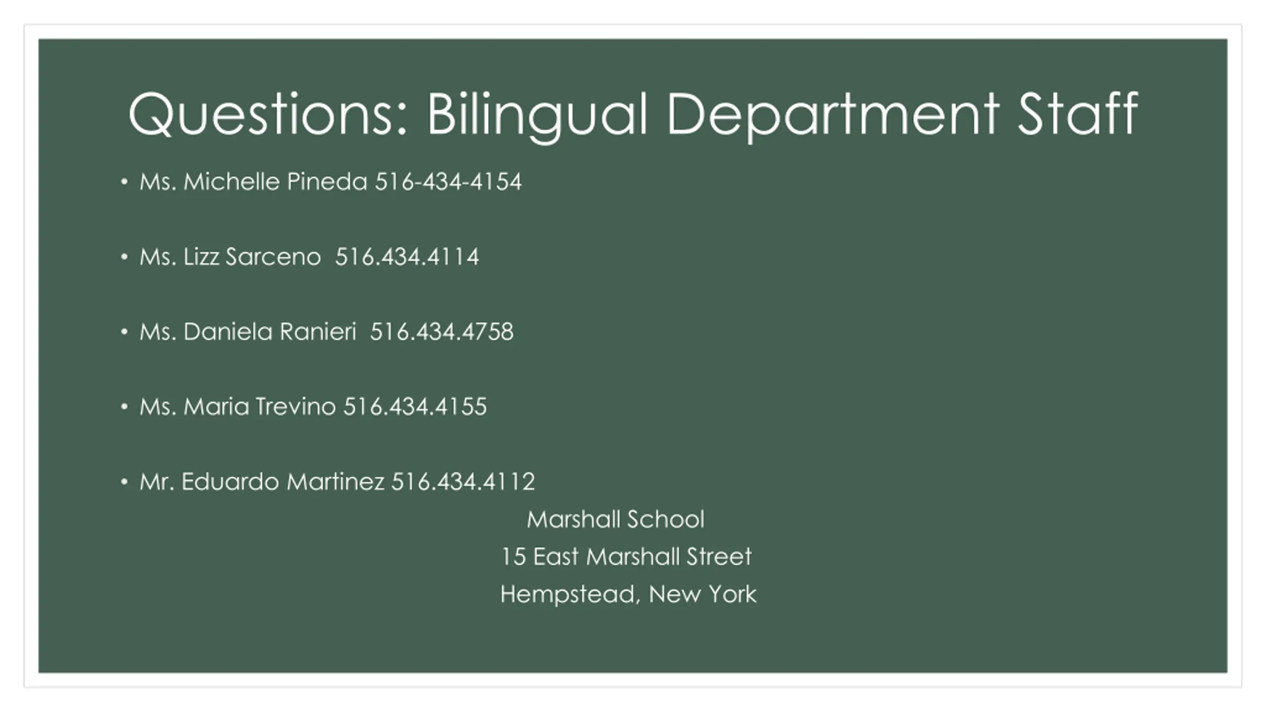Questions: Bilingual Department Staff Ms. Michelle Pineda 516-434-4154 Ms. Lizz Sarceno 516.434.4114 Ms. Daniela Ranieri 516.434.4758 Ms. Maria Trevino 516.434.4155 Mr. Eduardo Martinez 516.434.4112 Marshall School 15 East Marshall Street Hempstead, New York