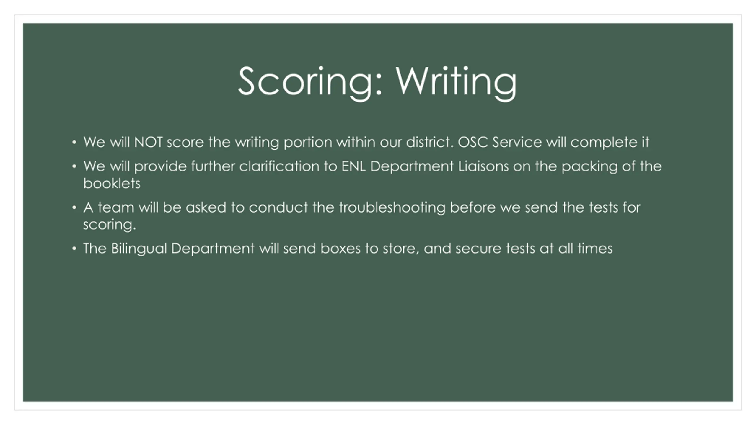 Scoring: Writing We will NOT score the writing portion within our district. OSC Service will complete it We will provide further clarification to ENL Department Liaisons on the packing of the booklets A team will be asked to conduct the troubleshooting before we send the tests for scoring. The Bilingual Department will send boxes to store, and secure tests at all times