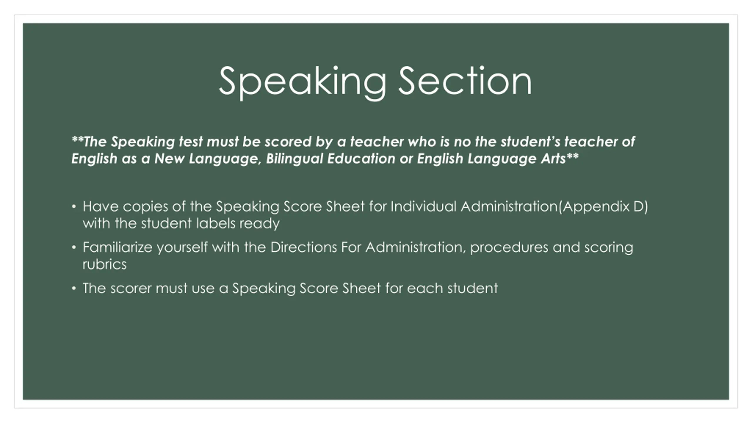 Speaking Section **The Speaking test must be scored by a teacher who is no the student s teacher of English as a New Language, Bilingual Education or English Language Arts** Have copies of the Speaking Score Sheet for Individual Administration(Appendix D) with the student labels ready Familiarize yourself with the Directions For Administration, procedures and scoring rubrics The scorer must use a Speaking Score Sheet for each student