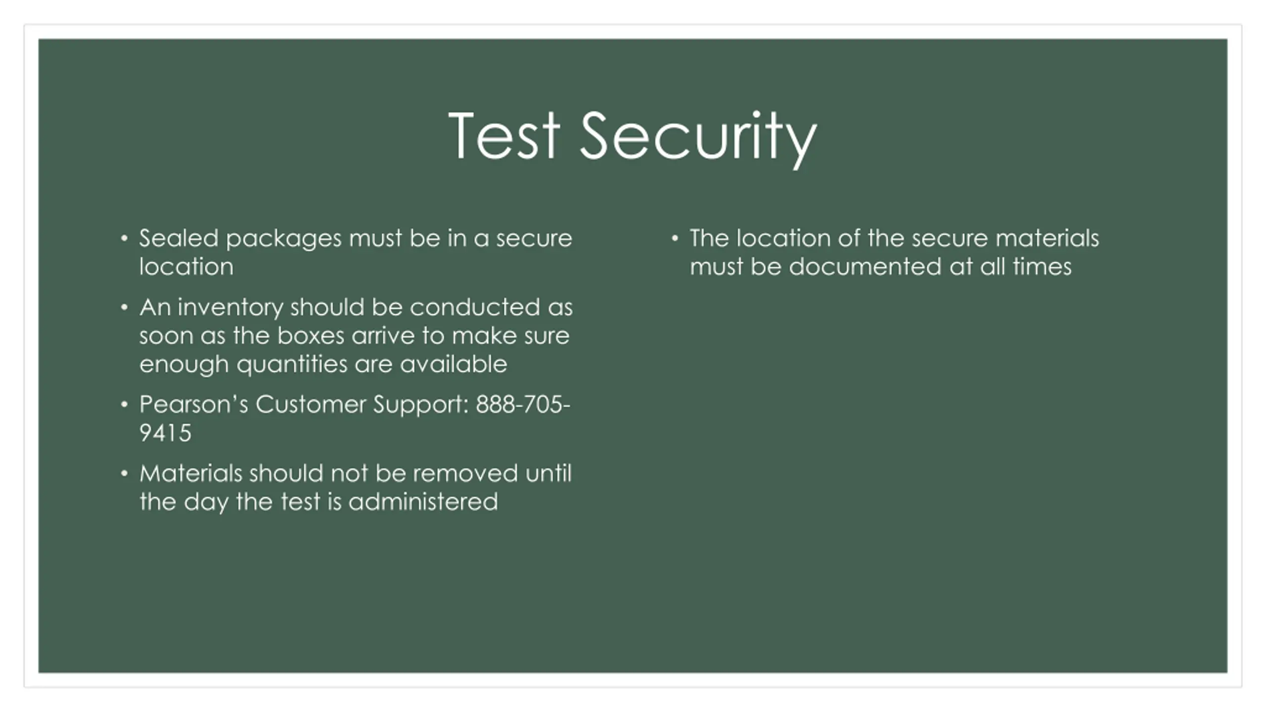 Test Security Sealed packages must be in a secure location An inventory should be conducted as soon as the boxes arrive to make sure enough quantities are available Pearson s Customer Support: 888-705- 9415 Materials should not be removed until the day the test is administered The location of the secure materials must be documented at all times