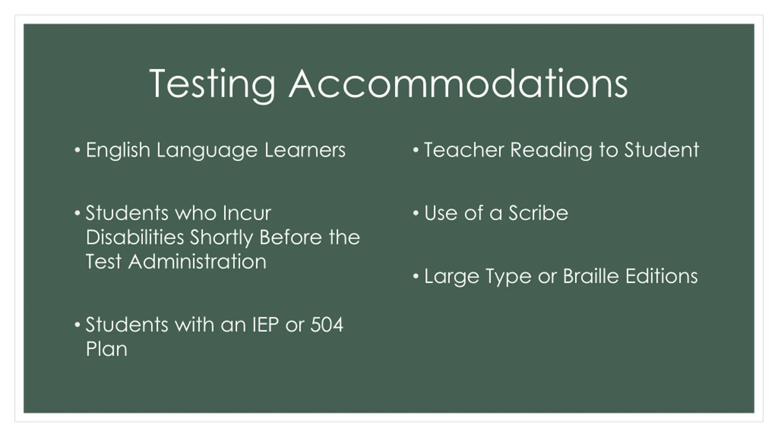 Testing Accommodations English Language Learners Teacher Reading to Student Students who Incur Disabilities Shortly Before the Test Administration Use of a Scribe Large Type or Braille Editions Students with an IEP or 504 Plan