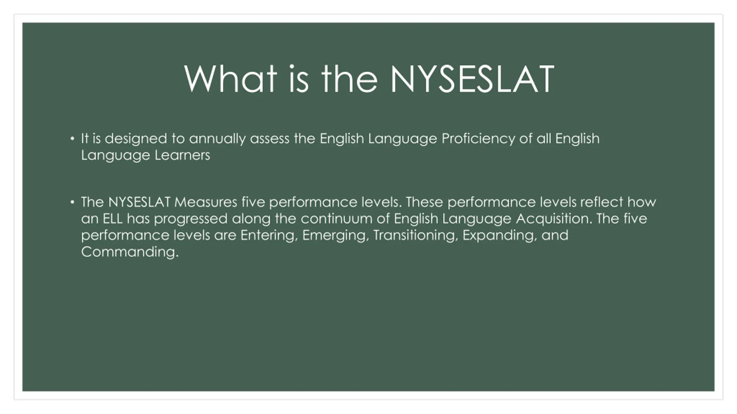 What is the NYSESLAT It is designed to annually assess the English Language Proficiency of all English Language Learners The NYSESLAT Measures five performance levels. These performance levels reflect how an ELL has progressed along the continuum of English Language Acquisition. The five performance levels are Entering, Emerging, Transitioning, Expanding, and Commanding.