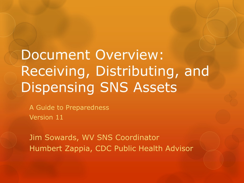 Document Overview: Receiving, Distributing, and Dispensing SNS Assets A Guide to Preparedness Version 11 Jim Sowards, WV SNS Coordinator Humbert Zappia, CDC Public Health Advisor