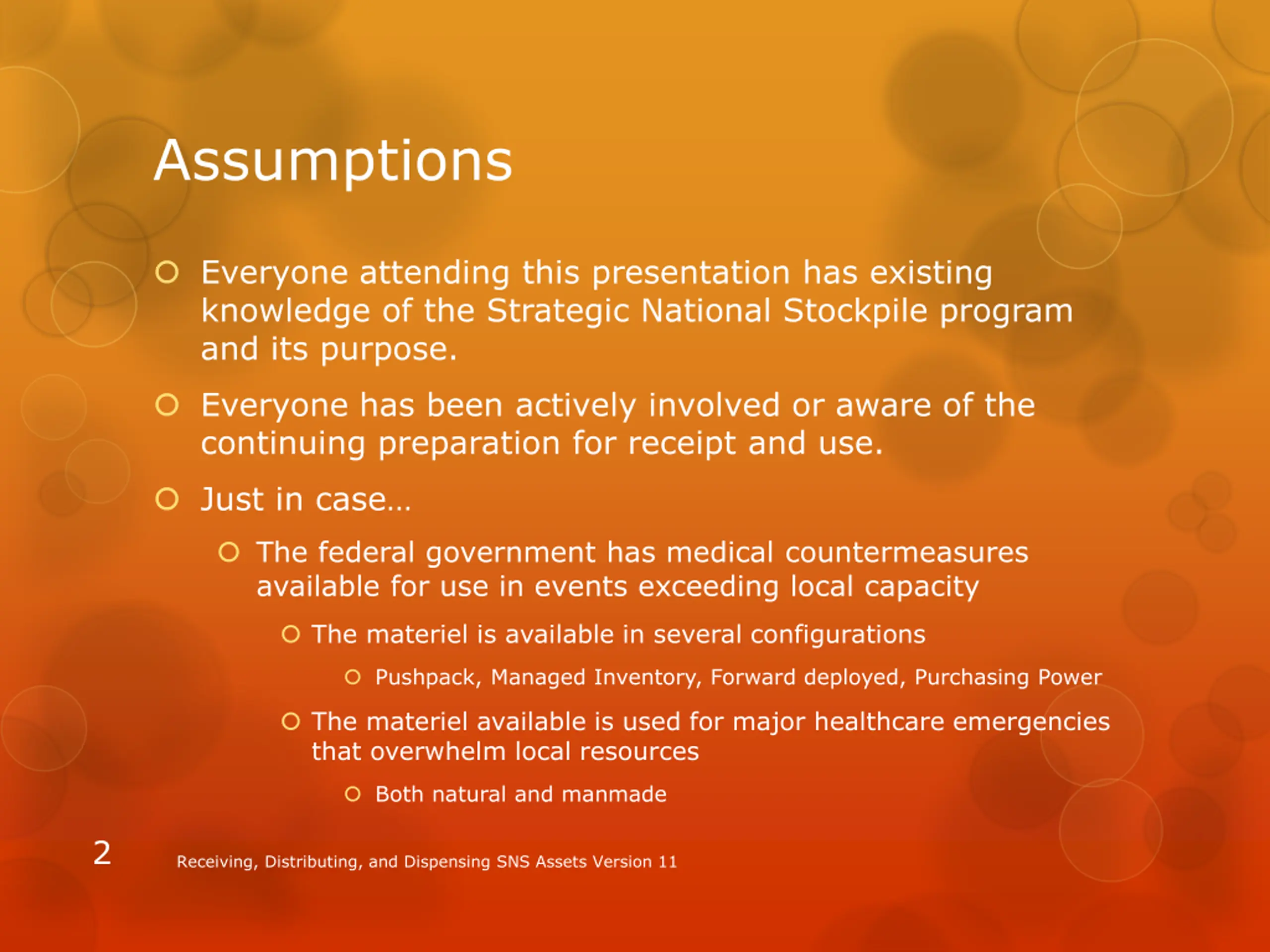 Assumptions Everyone attending this presentation has existing knowledge of the Strategic National Stockpile program and its purpose. Everyone has been actively involved or aware of the continuing preparation for receipt and use. Just in case The federal government has medical countermeasures available for use in events exceeding local capacity The materiel is available in several configurations Pushpack, Managed Inventory, Forward deployed, Purchasing Power The materiel available is used for major healthcare emergencies that overwhelm local resources Both natural and manmade 2 Receiving, Distributing, and Dispensing SNS Assets Version 11