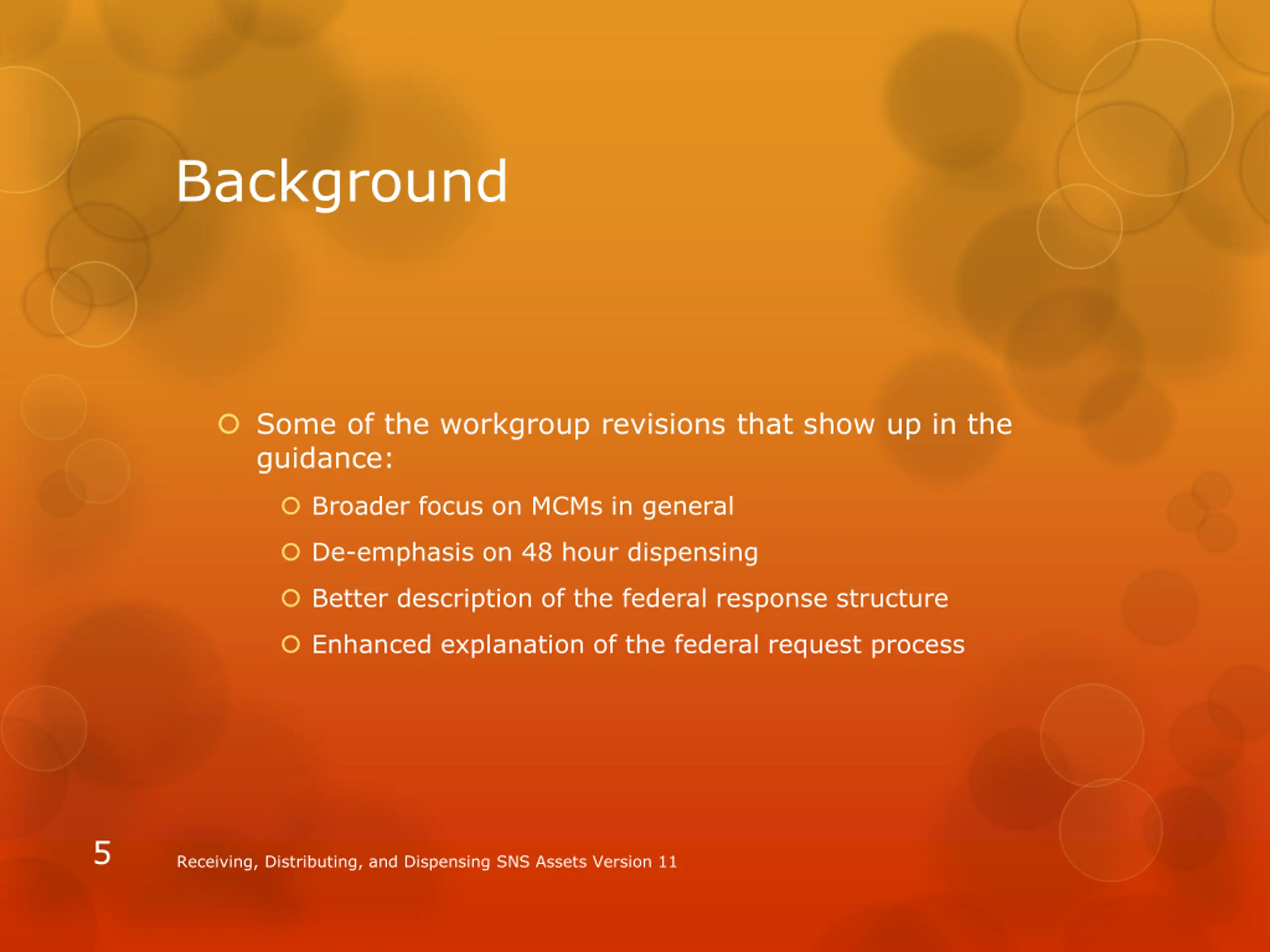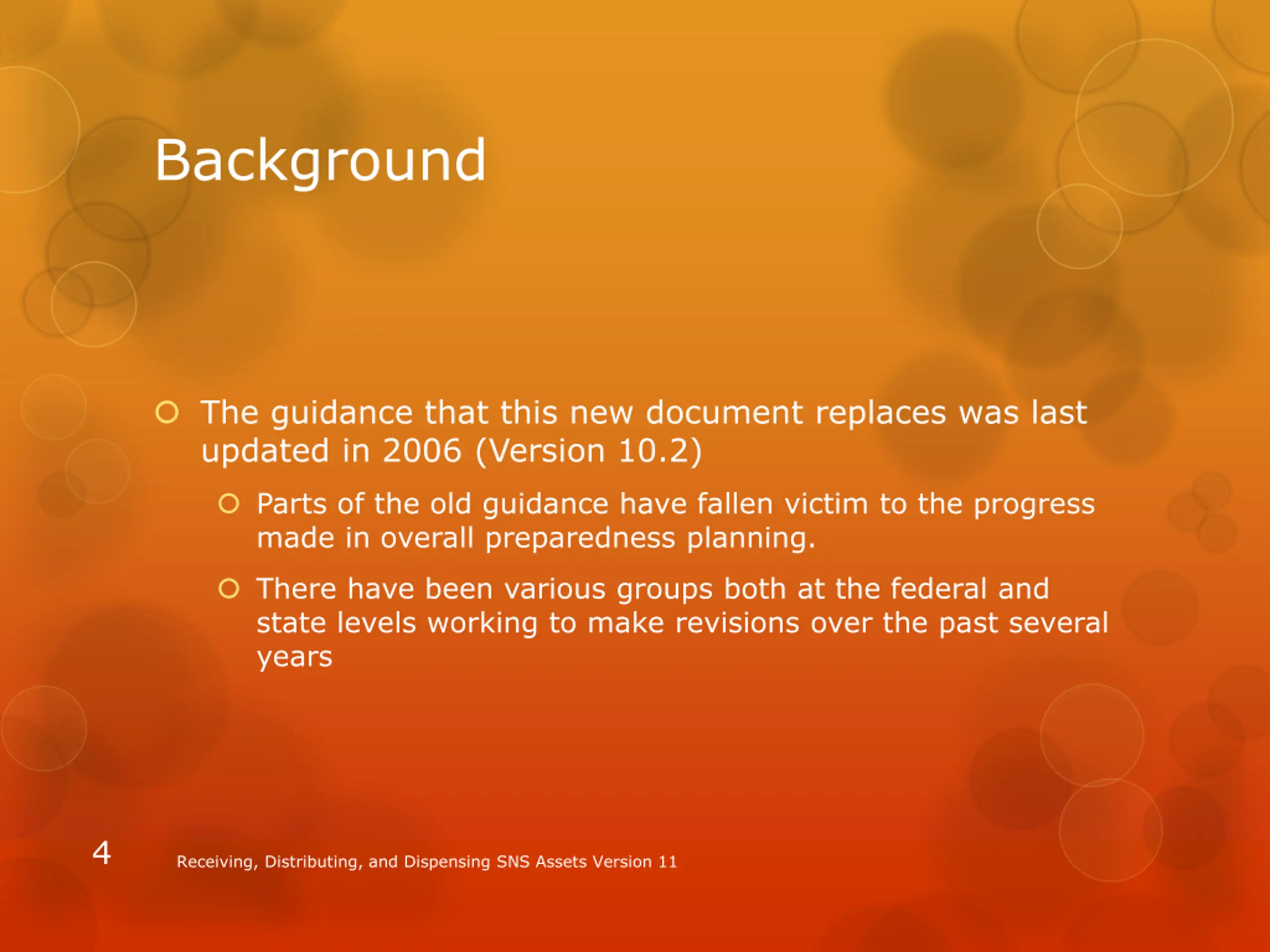 Background The guidance that this new document replaces was last updated in 2006 (Version 10.2) Parts of the old guidance have fallen victim to the progress made in overall preparedness planning. There have been various groups both at the federal and state levels working to make revisions over the past several years 4 Receiving, Distributing, and Dispensing SNS Assets Version 11