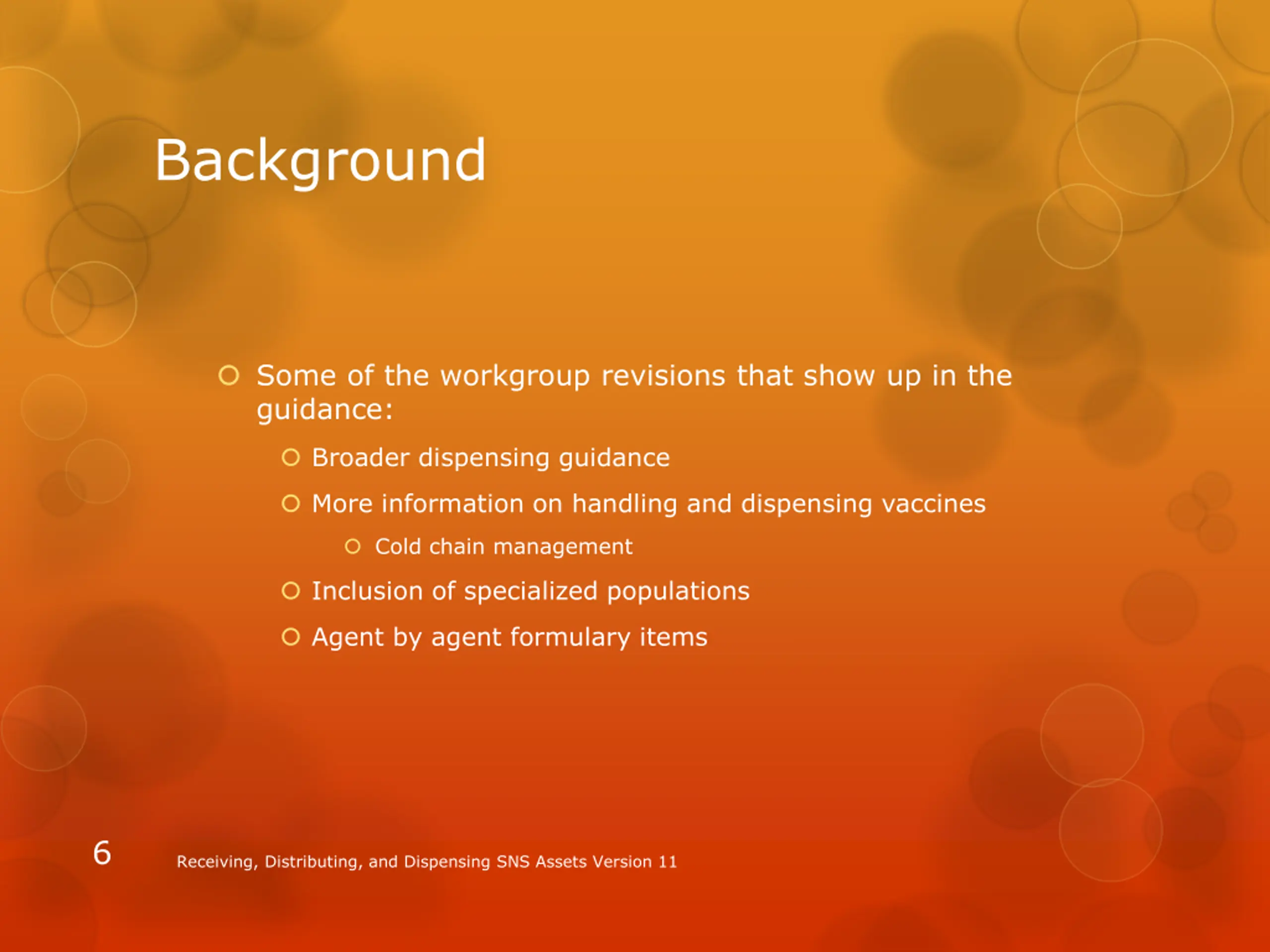 Background Some of the workgroup revisions that show up in the guidance: Broader dispensing guidance More information on handling and dispensing vaccines Cold chain management Inclusion of specialized populations Agent by agent formulary items 6 Receiving, Distributing, and Dispensing SNS Assets Version 11