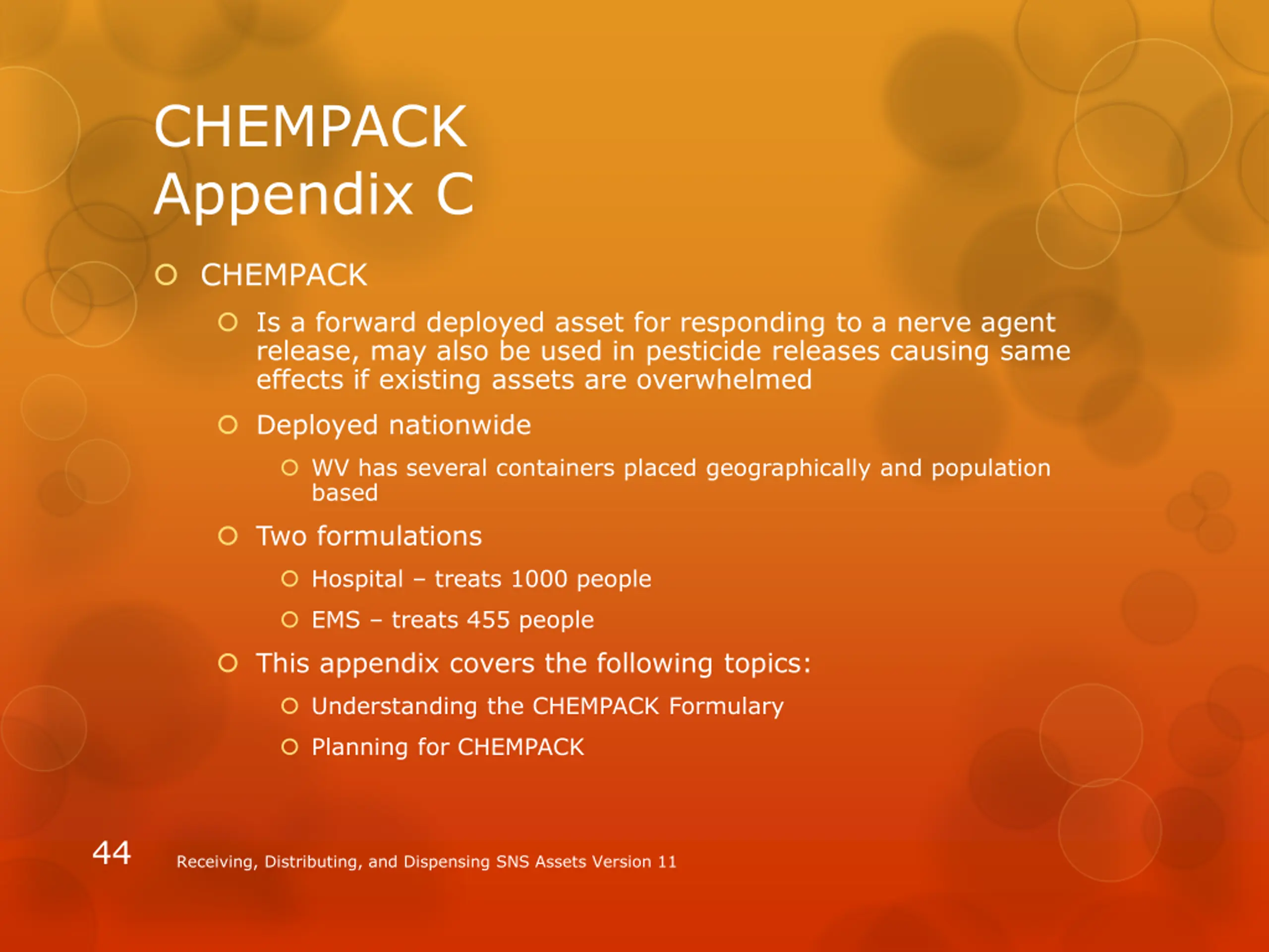 CHEMPACK Appendix C CHEMPACK Is a forward deployed asset for responding to a nerve agent release, may also be used in pesticide releases causing same effects if existing assets are overwhelmed Deployed nationwide WV has several containers placed geographically and population based Two formulations Hospital treats 1000 people EMS treats 455 people This appendix covers the following topics: Understanding the CHEMPACK Formulary Planning for CHEMPACK 44 Receiving, Distributing, and Dispensing SNS Assets Version 11