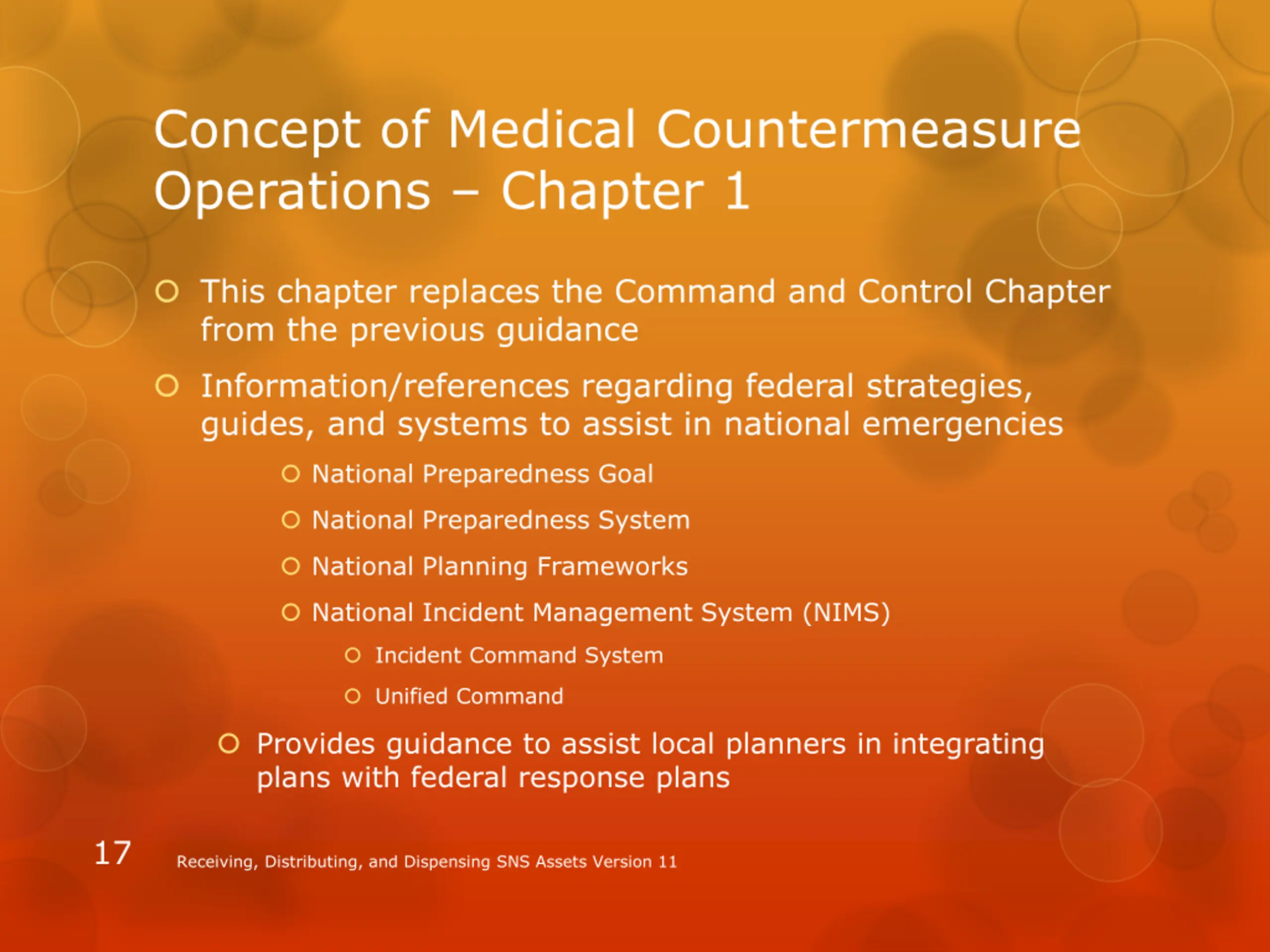 Concept of Medical Countermeasure Operations Chapter 1 This chapter replaces the Command and Control Chapter from the previous guidance Information/references regarding federal strategies, guides, and systems to assist in national emergencies National Preparedness Goal National Preparedness System National Planning Frameworks National Incident Management System (NIMS) Incident Command System Unified Command Provides guidance to assist local planners in integrating plans with federal response plans 17 Receiving, Distributing, and Dispensing SNS Assets Version 11