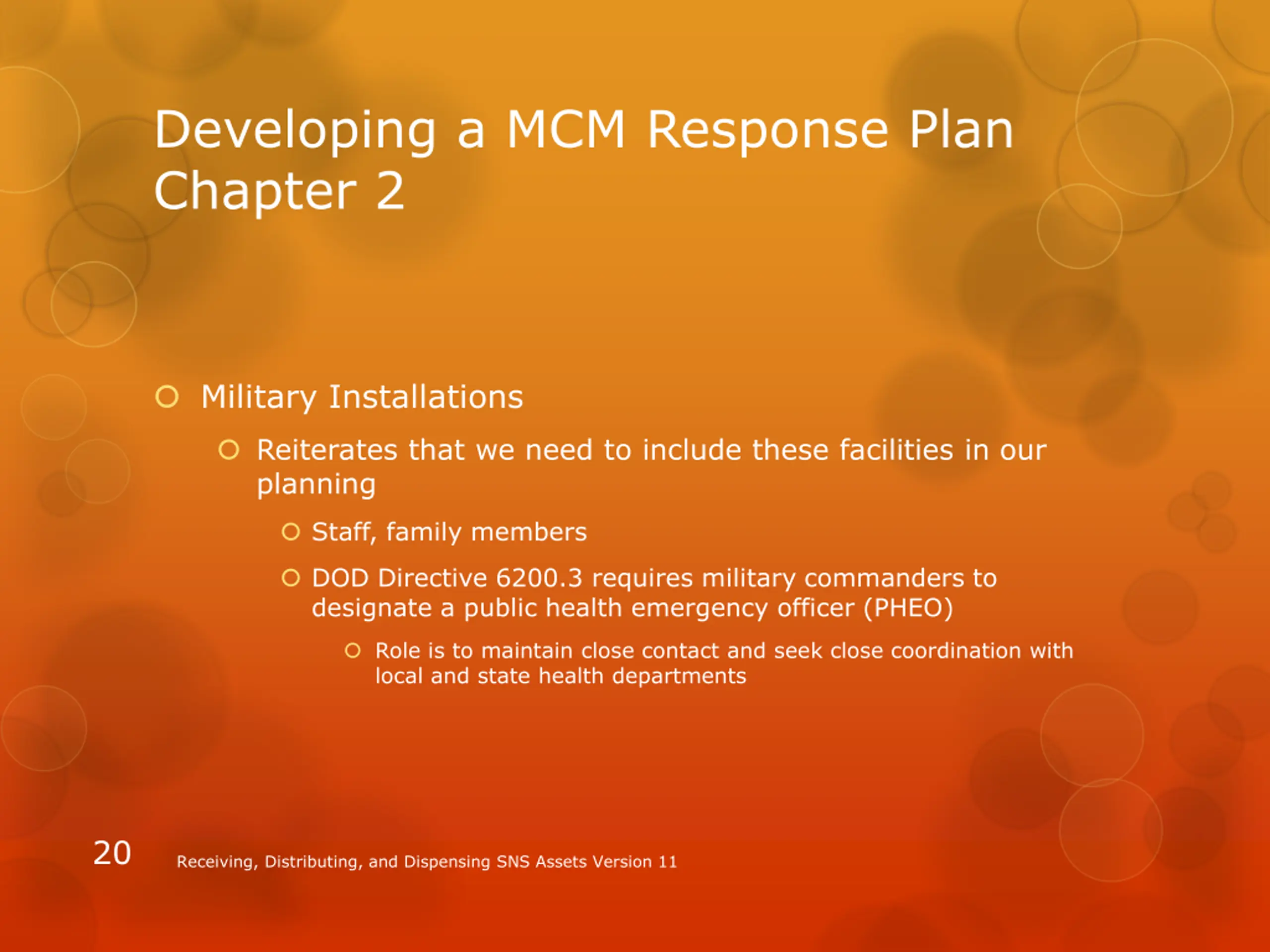 Developing a MCM Response Plan Chapter 2 Military Installations Reiterates that we need to include these facilities in our planning Staff, family members DOD Directive 6200.3 requires military commanders to designate a public health emergency officer (PHEO) Role is to maintain close contact and seek close coordination with local and state health departments 20 Receiving, Distributing, and Dispensing SNS Assets Version 11