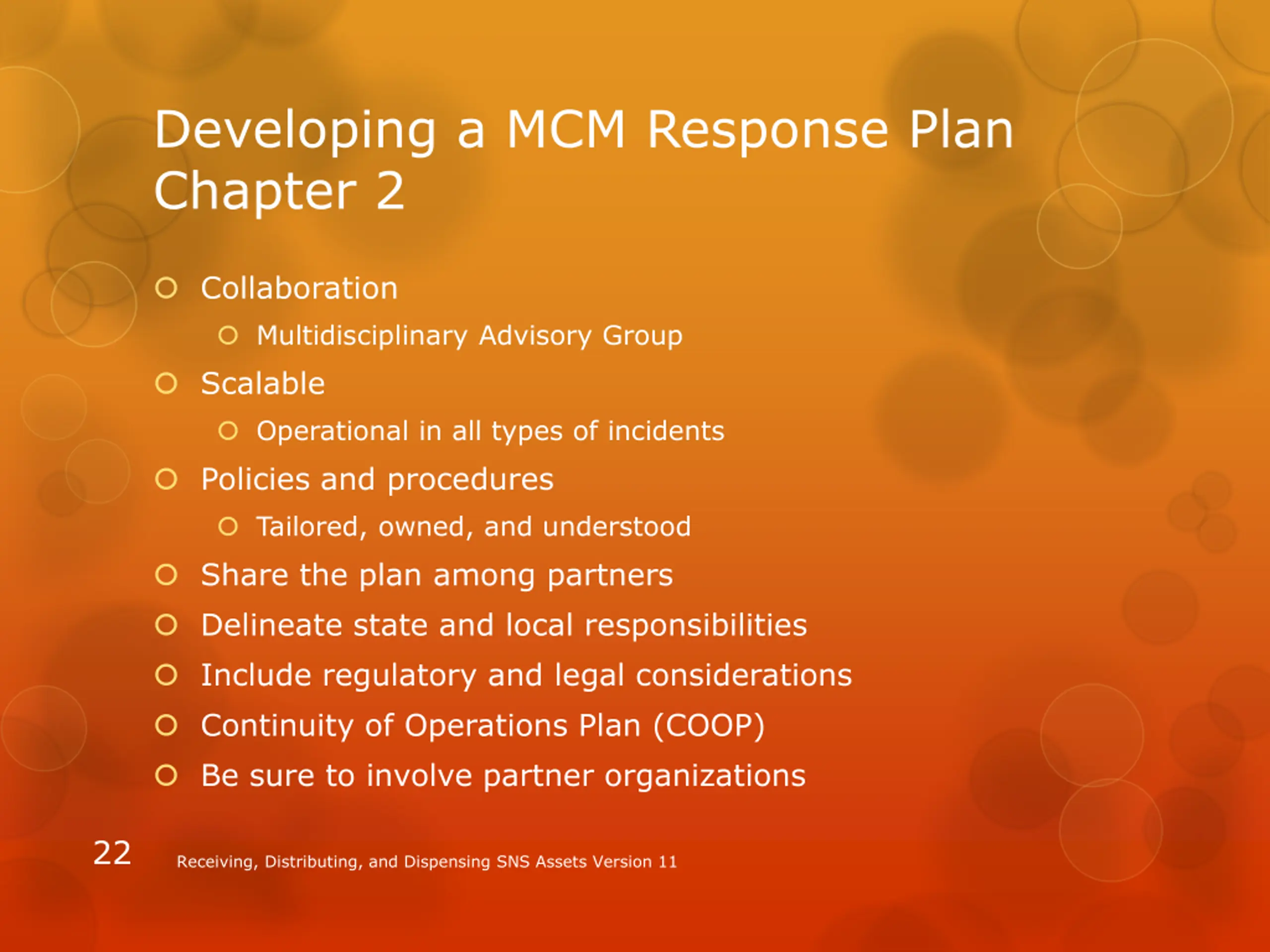 Developing a MCM Response Plan Chapter 2 Collaboration Multidisciplinary Advisory Group Scalable Operational in all types of incidents Policies and procedures Tailored, owned, and understood Share the plan among partners Delineate state and local responsibilities Include regulatory and legal considerations Continuity of Operations Plan (COOP) Be sure to involve partner organizations 22 Receiving, Distributing, and Dispensing SNS Assets Version 11