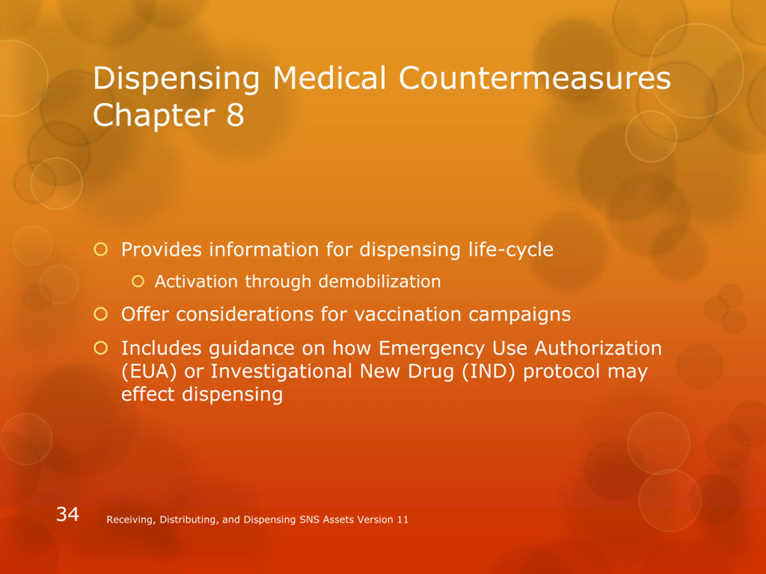 Dispensing Medical Countermeasures Chapter 8 Provides information for dispensing life-cycle Activation through demobilization Offer considerations for vaccination campaigns Includes guidance on how Emergency Use Authorization (EUA) or Investigational New Drug (IND) protocol may effect dispensing 34 Receiving, Distributing, and Dispensing SNS Assets Version 11