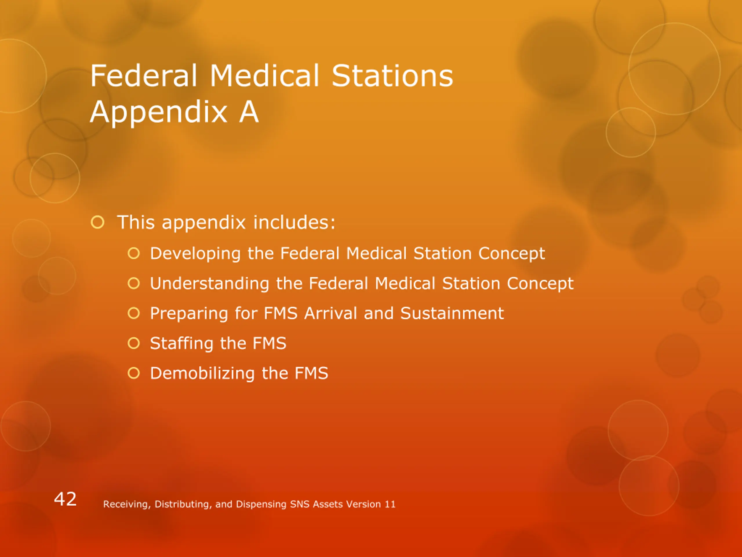 Federal Medical Stations Appendix A This appendix includes: Developing the Federal Medical Station Concept Understanding the Federal Medical Station Concept Preparing for FMS Arrival and Sustainment Staffing the FMS Demobilizing the FMS 42 Receiving, Distributing, and Dispensing SNS Assets Version 11